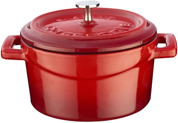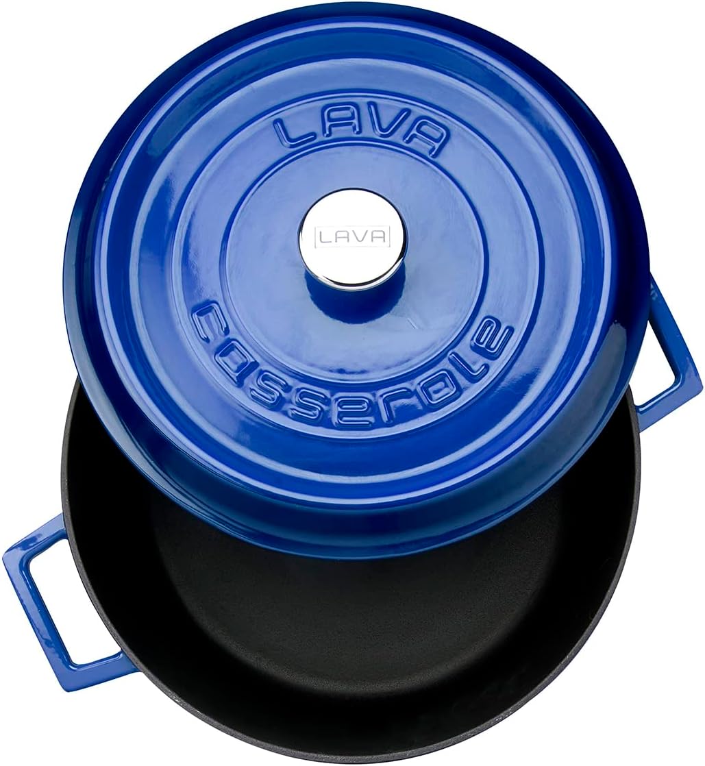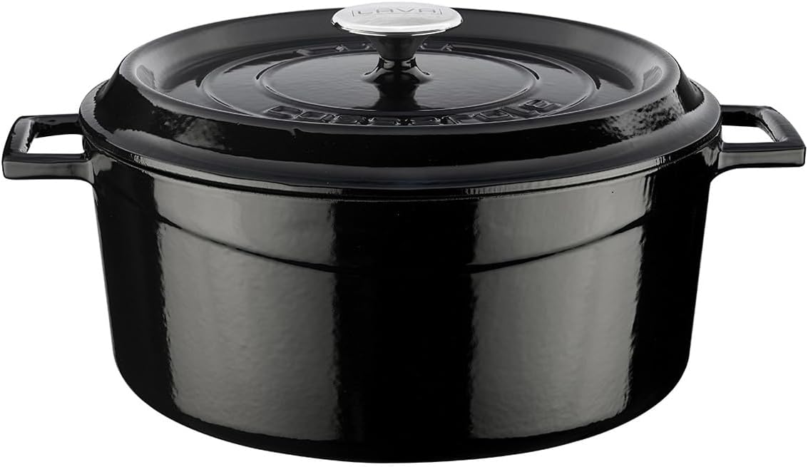 Lava's Signature 10-1/2 Quart round Dutch Oven's extra large cooking area is 13 inches wide and 5-1/2 inches tall (plus lid) and made expressly for creating large amounts of delicious culinary goodness. This modern oven is perfect for soups and stews, roasting duck and large chickens, slow cooking beef and pork or baking delicious delicate casseroles. Three layers of beautiful porcelain enamel are applied to hand finished cast iron and are fired twice for maximum beauty, lasting durability and superb cooking performance. The Chef preferred matte enamel finish on the inside is stain and chip resistant and easy to clean. Lava's premium cast iron and unique bottom and side wall design ensure yummy entrees, appetizers or tempting desserts cook evenly, predictably and reliably delicious every time. Only the best cookware in the world is made this way. Lava offers this pot with a limited lifetime warranty.