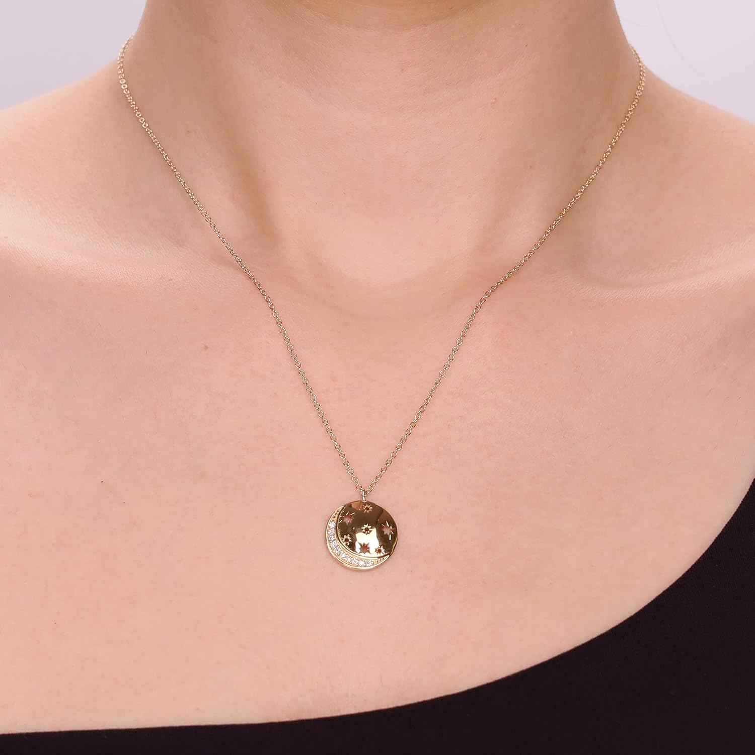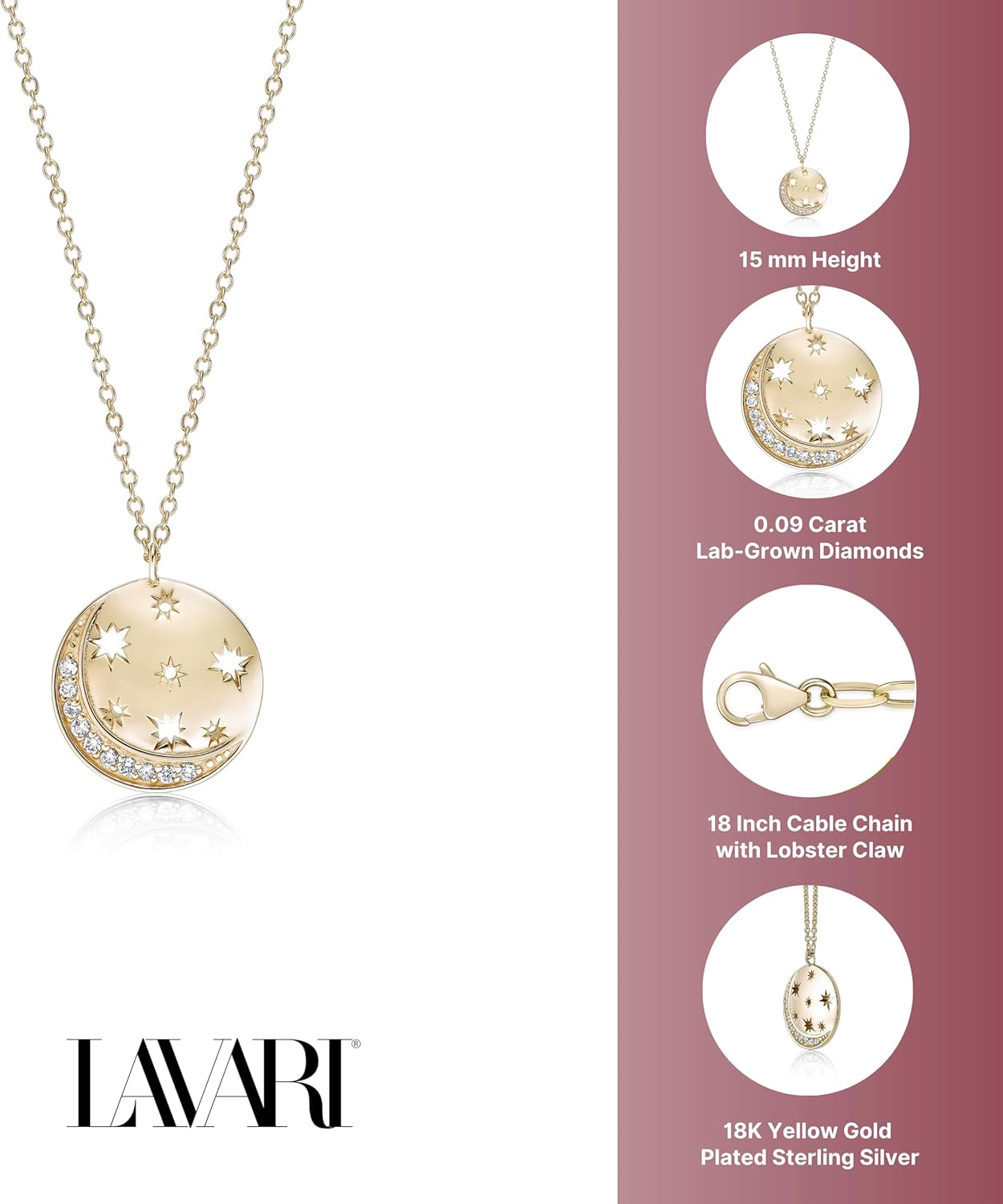 Lavari Jewelers Lab Grown Diamond Crescent Moon and Star Pendant Necklace, is a stunning accessory designed for women who cherish elegance and celestial beauty. This enchanting pendant is expertly crafted from 18k yellow gold plated silver, ensuring a luxurious look that complements any outfit. The pendant features a beautifully detailed moon and star design, adorned with lab-grown diamonds totaling 0.09 carats, with a high-quality rating of G-H for color and VS2-SI1 for clarity. This stunning piece not only adds a touch of sparkle to your ensemble but also reflects a commitment to ethical sourcing.The 18-inch chain, secured with a reliable lobster claw clasp, provides both comfort and style, making it ideal for everyday wear or special occasions. Whether you're dressing up for a night out or adding a subtle touch of glamour to your daily attire, this pendant necklace is a versatile addition to your accessory wardrobe.In addition to this captivating pendant, Lavari Jewelers proudly offers an entire collection of matching pieces, including exquisite rings, elegant earrings, stylish bracelets, and a variety of piercing jewelry. This allows you to create a cohesive look that expresses your unique style. You can easily mix and match our jewelry pieces to enhance your outfit and make a statement wherever you go.Perfect for gifting or as a treat for yourself, this pendant necklace comes beautifully packaged, making it a thoughtful choice for birthdays, anniversaries, or any special occasion. The lab-grown diamonds not only shine brilliantly but also allow you to embrace a more sustainable and responsible approach to luxury.Discover the beauty of the cosmos with the Lavari Jewelers Lab Grown Diamond Moon and Star Pendant Necklace. It's time to add a sprinkle of elegance and charm to your jewelry collection. Shop now and explore our full range of matching accessories to find the perfect pieces to complement your new favorite necklace!