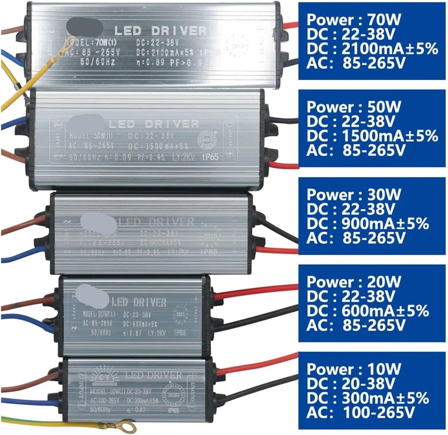 Low Voltage TransformersProduct Details10WPower: 10WOutput voltage: DC 20-38VInput voltage: AC 100-265VCurrent: 300mA±5%Size: 67*24*20mm20WPower: 20WOutput voltage: DC 22-38VInput voltage: AC 85-265VCurrent: 600mA±5%Size: 82*28*21mm30WPower: 30WOutput voltage: DC 22-38VInput voltage: AC 85-265VCurrent: 900mA±5%Size: 88*29*21mm50WPower: 50WOutput voltage: DC 22-38VInput voltage: AC 85-265VCurrent: 1500mA±5%Size: 95*35*23mm70WPower: 70WOutput voltage: DC 22-38VInput voltage: AC 85-265VCurrent: 2100mA±5%Size: 106*31*23mm