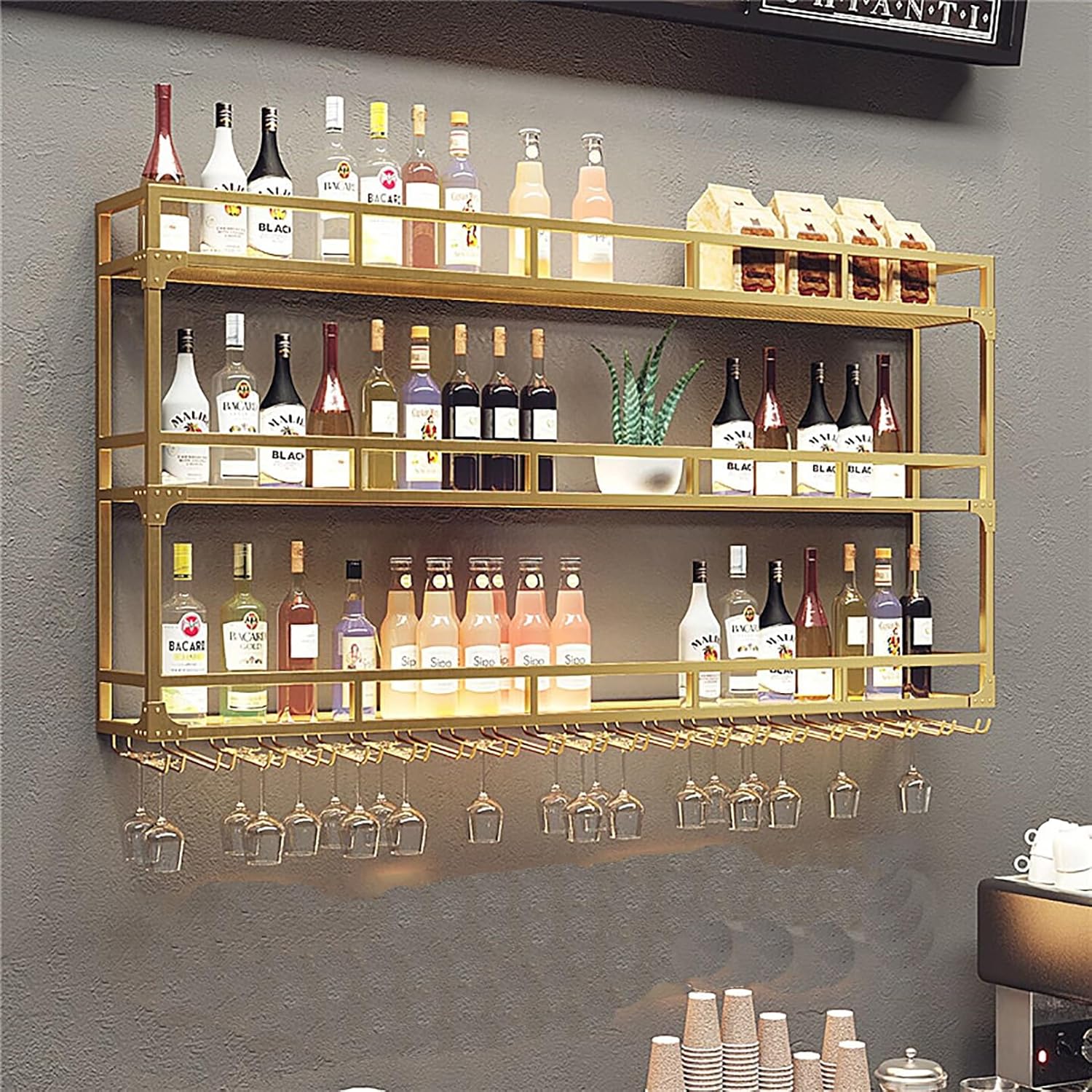 Elevate your home decor with our elegant wall mounted wine rack, a perfect blend of style and functionality. This wine rack not only enhances the aesthetic of your living space but also provides an efficient solution for storing your cherished wine bottles and glasses. **Key Features:** - **Effortless Access**: Enjoy the convenience of easy access to your wine glasses with our thoughtfully designed glass shelf. No more fumbling around; everything you need is within reach. - **Multi-Purpose Storage**: This versatile wine rack is not limited to wine glasses alone. It‘s also perfect for storing goblets and cocktail glasses, making it an ideal addition to any home bar or kitchen. - **Smart Design**: The shelf features a well-considered design with ample aisle spacing, ensuring you can hang and retrieve glasses with ease, while maximizing your wall space. - **Robust and Reliable**: Crafted from sturdy iron and secured with screws, this wall mounted wine rack is built to last, providing a stable and secure storage solution for your glassware. **Product Details:** - Name: Wall Mounted Wine Rack - Material: Iron - Color Options: Gold, Black - Style: Nordic - Ideal for: Living Room, Bedroom, Hotels, Restaurants, Bars, Cafes **Package Includes**: Wall Mounted Wine Rack x 1 Transform your living areas into elegant spaces with this stylish wine rack that reflects your taste and complements your lifestyle. Please note that due to lighting and monitor differences, actual colors may vary slightly. Allow for minor measurement variations of 1-3 cm. Discover the perfect blend of practicality and design with our wall mounted wine rack, and create a welcoming atmosphere in your home.