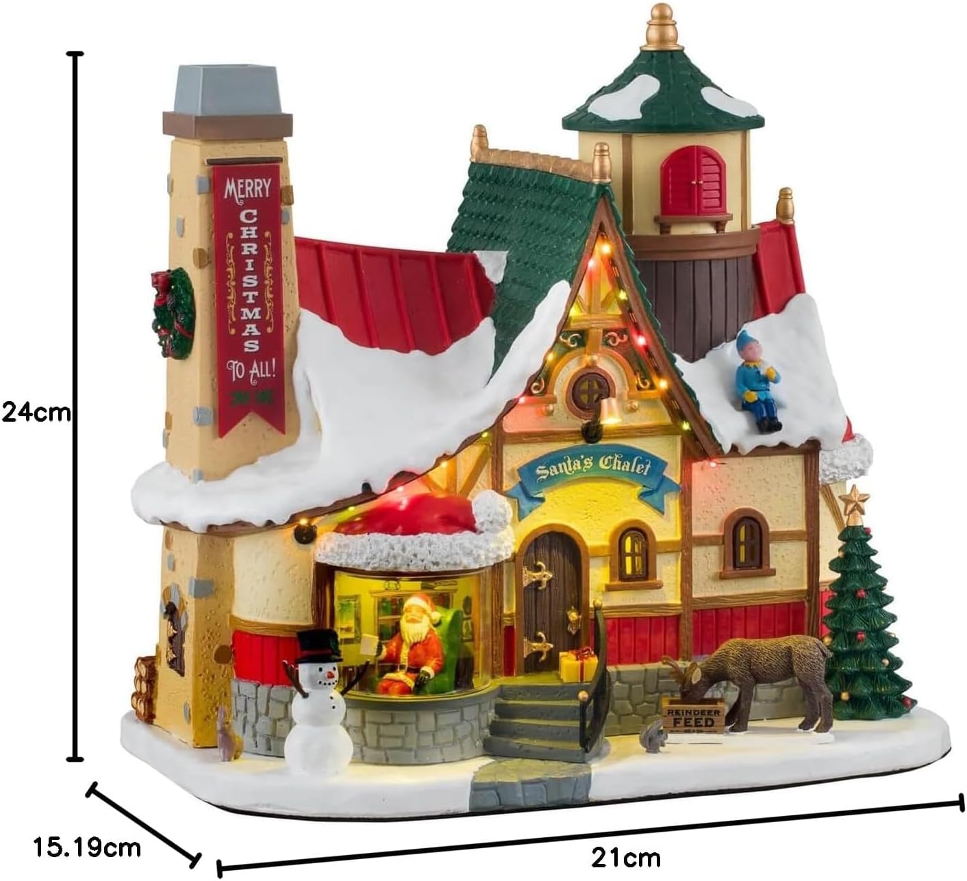 Here he is, folks, the man you have all been waiting to see! Santa looks incredibly cheerful and comfortable in his amazing chalet. With different color lights sparkling along the cornices, an illuminated Christmas tree, and smoke coming out through the chimney, this is deservedly one of the most impressive buildings in Santa’s Wonderland. Peep at the cheeky elf taking a break from work on the snowy roof!
