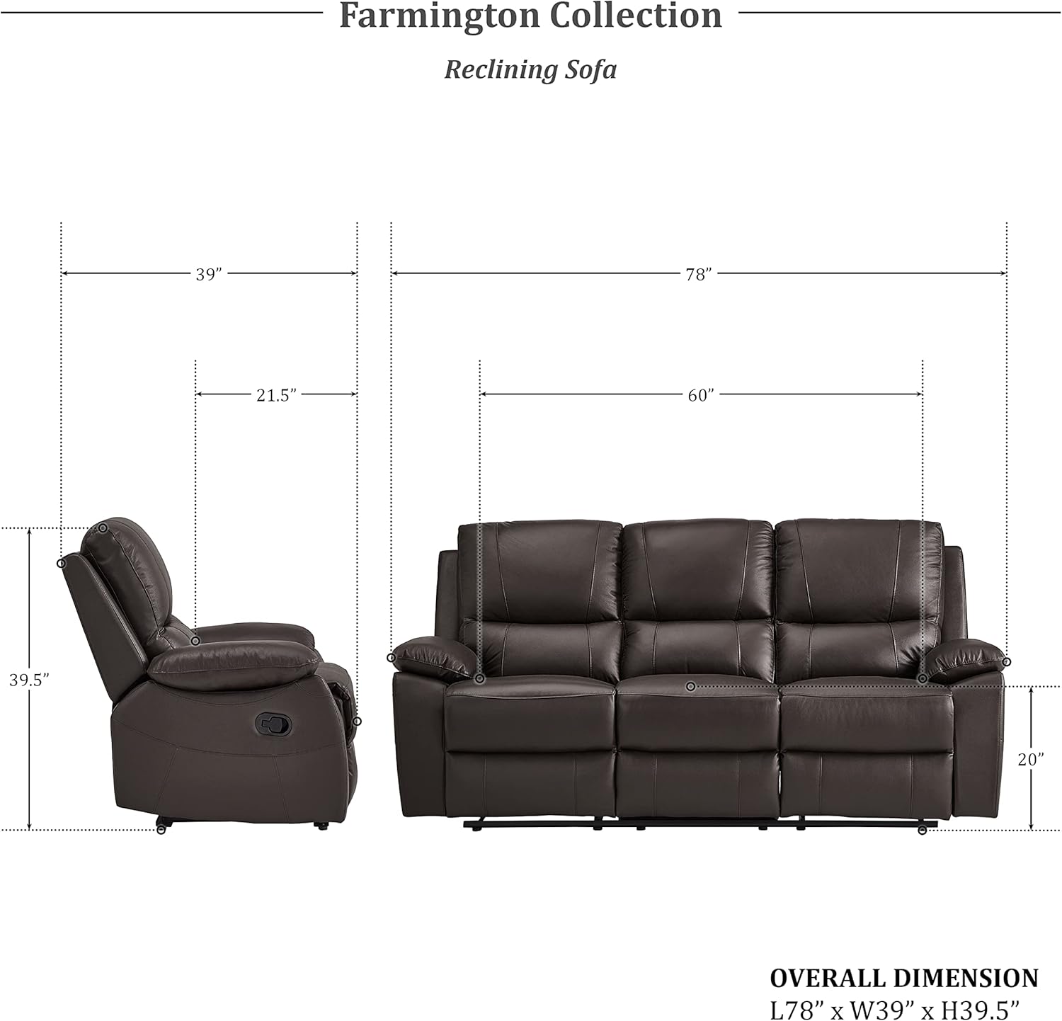 The Farmington Collection’s transitional style pairs ample seating, plush pillowtop arms, and a brown faux leather upholstered cover to create a welcoming spot for relaxation. The sofa features dual manual motion reclining mechanisms which are engaged with a side pull tab, easing you into a reclined position.