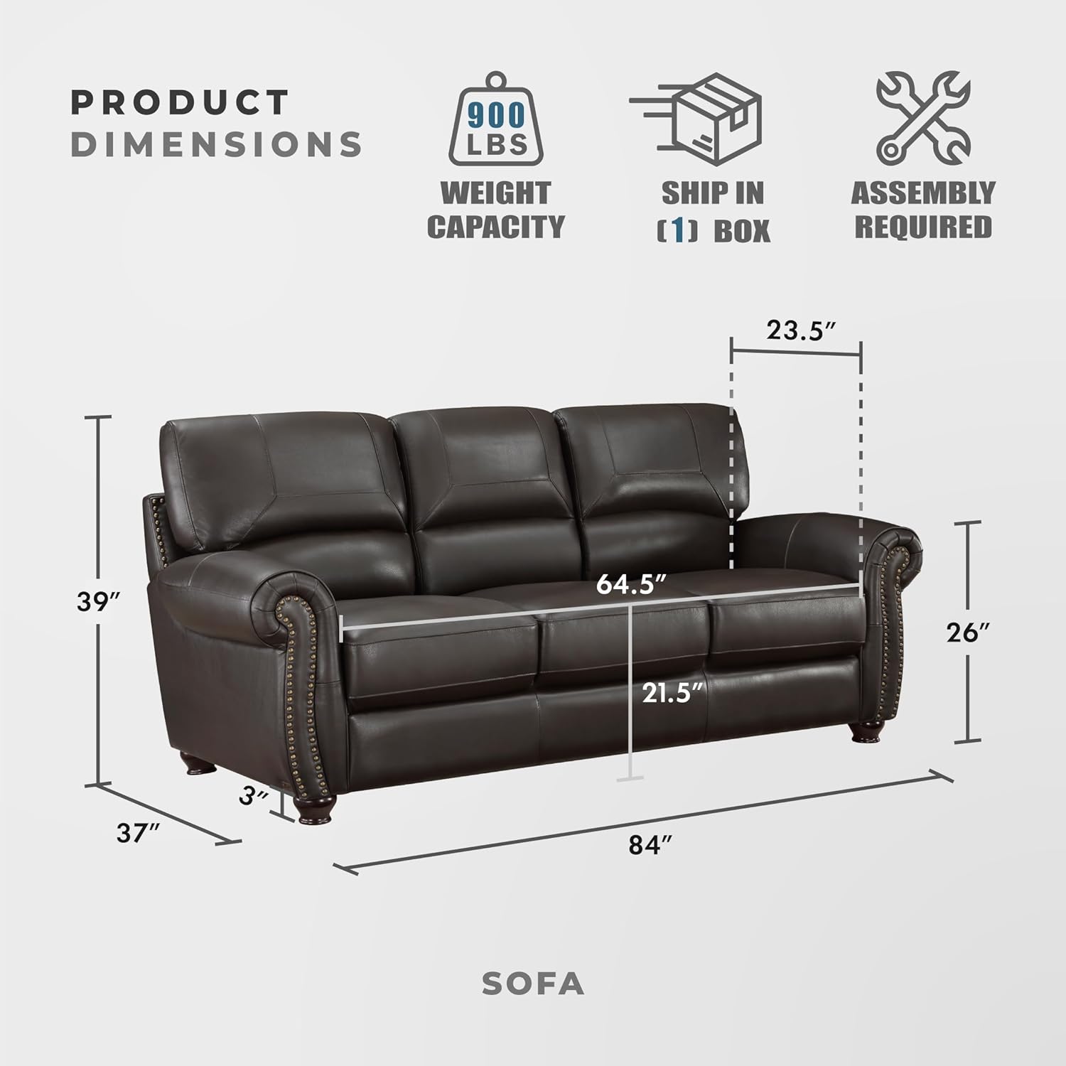 Transform your living space into a haven of sophistication and comfort with the Lexicon leather couch. Crafted with meticulous attention to detail, this luxurious 3-seater sofa is the epitome of refined elegance and durably engineered to meet your everyday needs. Featuring a wood frame that assures longevity and sturdy support, this small couch exudes strength and stability. Adorned with rolled armrests and nailhead trim, it brings in elements of classic style that blend seamlessly with contemporary decor trends. The top grain leather upholstery provides an inviting touch, making it perfect for living rooms, bedrooms, offices, or waiting rooms. Upgrade your home experience with this versatile piece of living room furniture. Whether you're curling up to watch a movie on your couches for living room or hosting guests who need a place to sleep, this sleeper sofa serves multiple purposes without sacrificing style or comfort. Feel the difference as you sink into its oversized seats after a long day at work; it’s not just a sofas for living room but an oasis designed to provide the ultimate relaxation experience. For those on the lookout for quality couches for living rooms or adding an accent piece like a love seat or chaise lounge chair indoors, our Lexicon living room couch fits perfectly within any setting. Its timeless appeal works wonderfully next to other pieces from our range including ottomans, small couches, sofa beds, sectionals, and premium furniture sets that complete your ideal space. Its also an excellent alternative to sofa cama or sleeper sofas if you're looking for multifunctional furniture options in compact spaces. Give your home the cloud couch feel you've always desired while ensuring durability that's built to last with Lexicons signature craftsmanship. Discover why so many choose Lexicon for their living room set needs today!