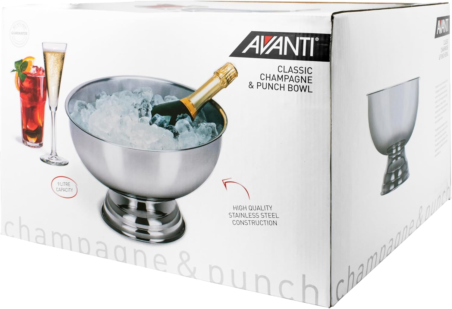Host stylish gatherings with the Avanti Classic Champagne & Punch Bowl. Perfect for parties, its spacious stainless steel bowl keeps champagne and various bottles chilled on ice. Crafted from durable stainless steel, it showcases a trendy footed base for stability, turned edges, and a gleaming mirror finish. This versatile bowl also serves as a punch bowl, accommodating homemade punch or aromatic mulled wine. With a generous 9L capacity, it's suitable for both indoor and outdoor use.