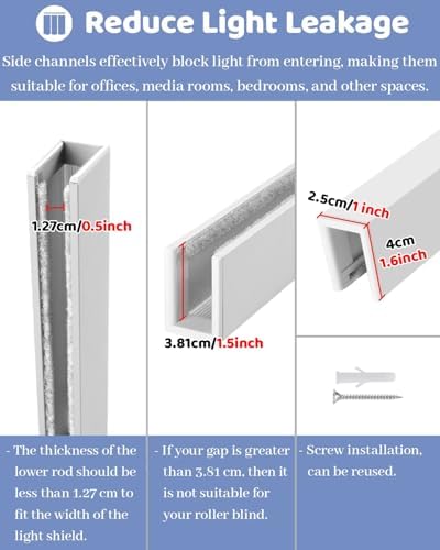 **Specifications:**- **Material:** Durable Aluminium Alloy- **Color Options:** Elegant White, Sophisticated Gray, Classic Black- **Length:** Customizable from 27.9cm to 248.9cm (11 to 98 inches)- **Width Compatibility:** Fits roller blinds less than 1.27cm (0.5 inches)- **Minimum Window Depth:** Requires more than 2.54cm (1 inch)- **Adjustable Distance:** 0.5 to 3.81cm (0.95 to 1.5 inches)- **Installation:** All necessary screws included for a hassle-free setup**Features:**- Blocks up to 97% of light, ensuring optimal darkness for a restful night’s sleep.- Sleek design that complements any home decor style.- Custom sizes available to ensure a perfect fit for your windows.- Enhances privacy while minimizing drafts for added comfort.- Effectively eliminates light leaks, contributing to improved sleep quality.- Simple installation process suited for all skill levels.**Package Contents:**- 2 x Light blocking strips- Complete accessory kit for easy installation**Please Note:**- Ensure windows are vertically aligned for the best installation results.- For an impeccable finish, consider using seam sealant or repair paste (not included).- Size variations may occur due to measurement methods.- Actual product color may differ slightly from images due to lighting and screen settings.
