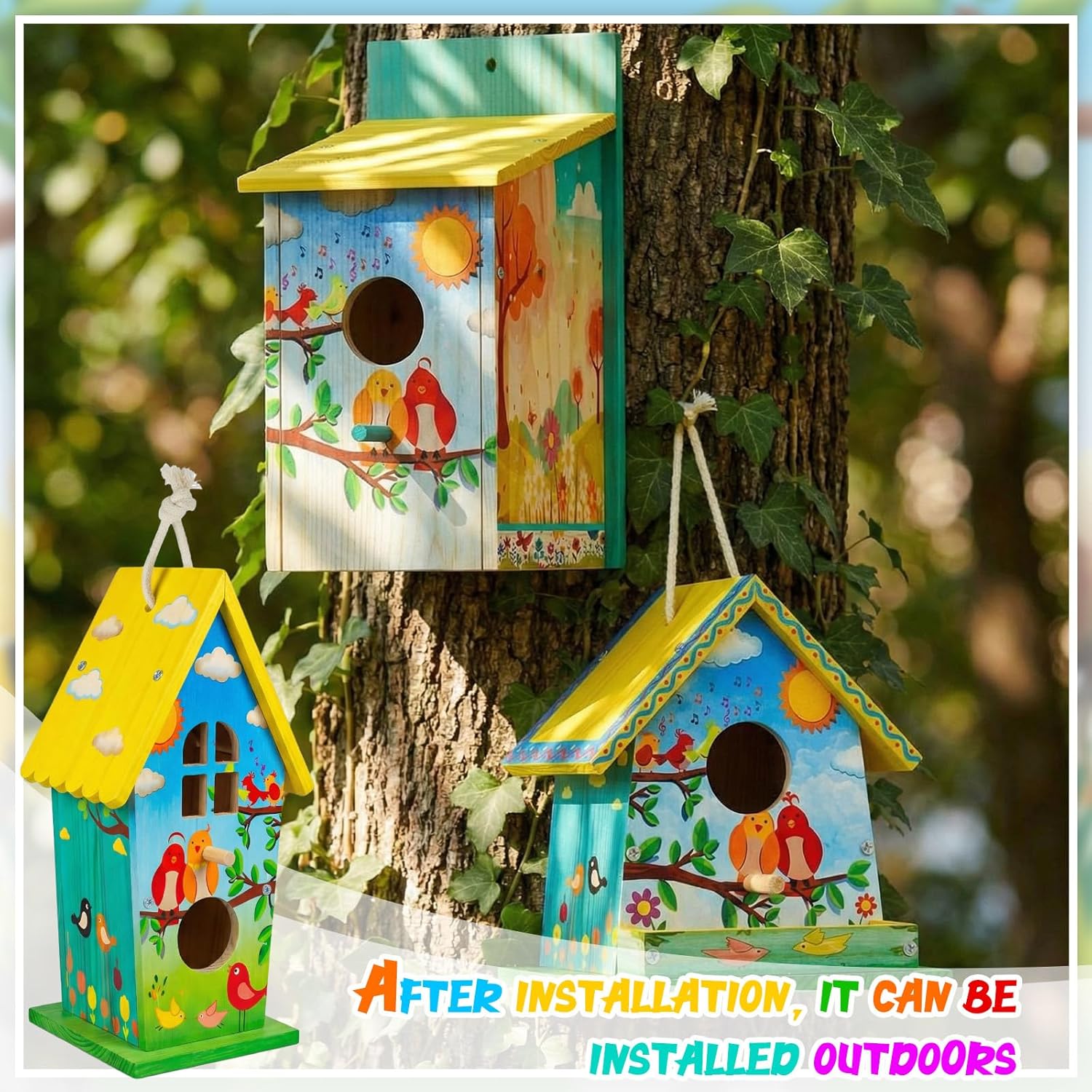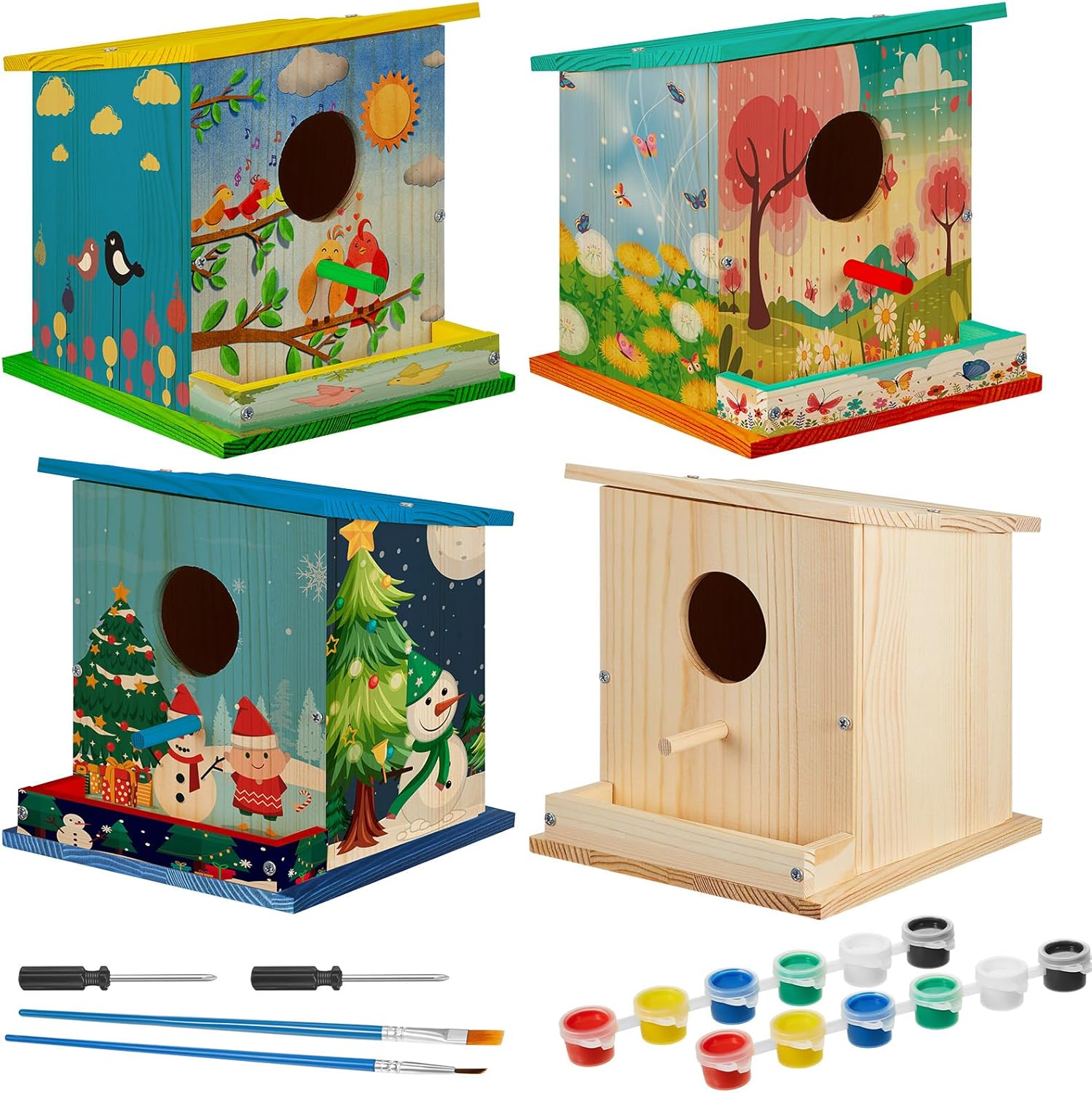 Features: The birdhouse arts and crafts offer a blank place for your creativity, allowing you to create distinctive masterpieces that will brighten up your garden or backyard. The wooden houses for crafts are ideal for a fun and engaging family activity. They provide an opportunity for parents and little ones to connection over the fun of painting and assembling birdhouses together. Specifications: Material: wood Color: red, yellow, blue, green, white, black Size: approx. 6 x 6.5 x 6.75 inches Package includes: 4 x Unfinished wooden birdhouse 4 Sets of painting tools 4 x Screwdrivers Notes: Manual measurement, please allow slight errors on size. The color may exist a slight difference due to different screen displays. Little ones under 12 years old should use this product under the supervision of adults. Small items are included, please use and store them carefully to avoid accidental eating and choking risks