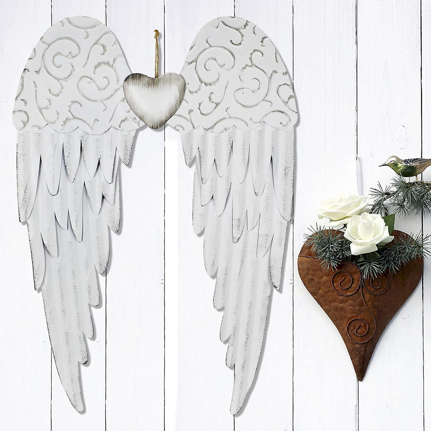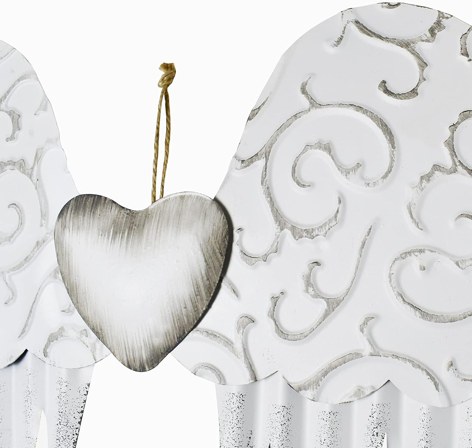 Metal Angel Wings Decoration Distressed Hanging Angel Metal Wings Decor with Decorative Heart Memory Angel Wings for Wall Decor Beautiful Metal Wings SculptureMEMORIAL GIFT IDEA: Heavenly angel wings decor is ideal sympathy gift and memorial gifts for losing loved one. It is also fits for memory wall.ANGLE WINGS DECOR: Angel wall hanging decor is detailedly crafted with handmade quality. Sweet and cheerful angel wings home decor will bring peace and love to your home, and add a religious touch to your room decor. METAL WINGS WALL ART: Angel wings wall decoration is made of premium metal material, hand painted in rustic style. Angel wings wall hanging decor is durable and ECO-friendly. Compliment your angel themed home decor with the beautiful patina of the decorative angle wings wall decor.DECORATIVE HANGING WINGS: Hanging angel wings metal decor is great for both indoor and outdoor wall decorating. Add a sacred and whimsical touch to your living room, sitting room, kitchen, bed room, dining room, entryway and garden with the cute hanging metal angel wings.PACKING: 1 X metal hanging angel wings decor.