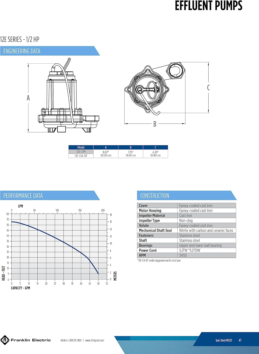 | Item Type Name | 12E-CIM 115 Volt, 1/2 HP, 3000 GPH Cast Iron Manual Submersible Effluent Pump with 20-Ft. Cord |