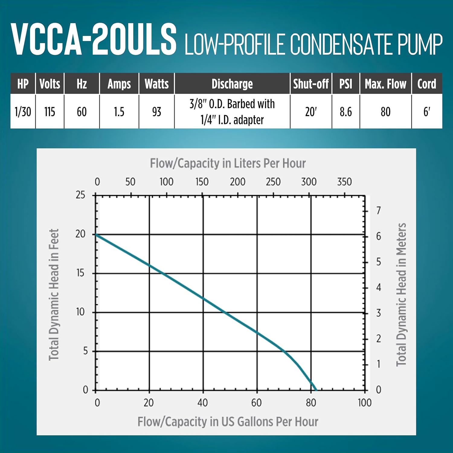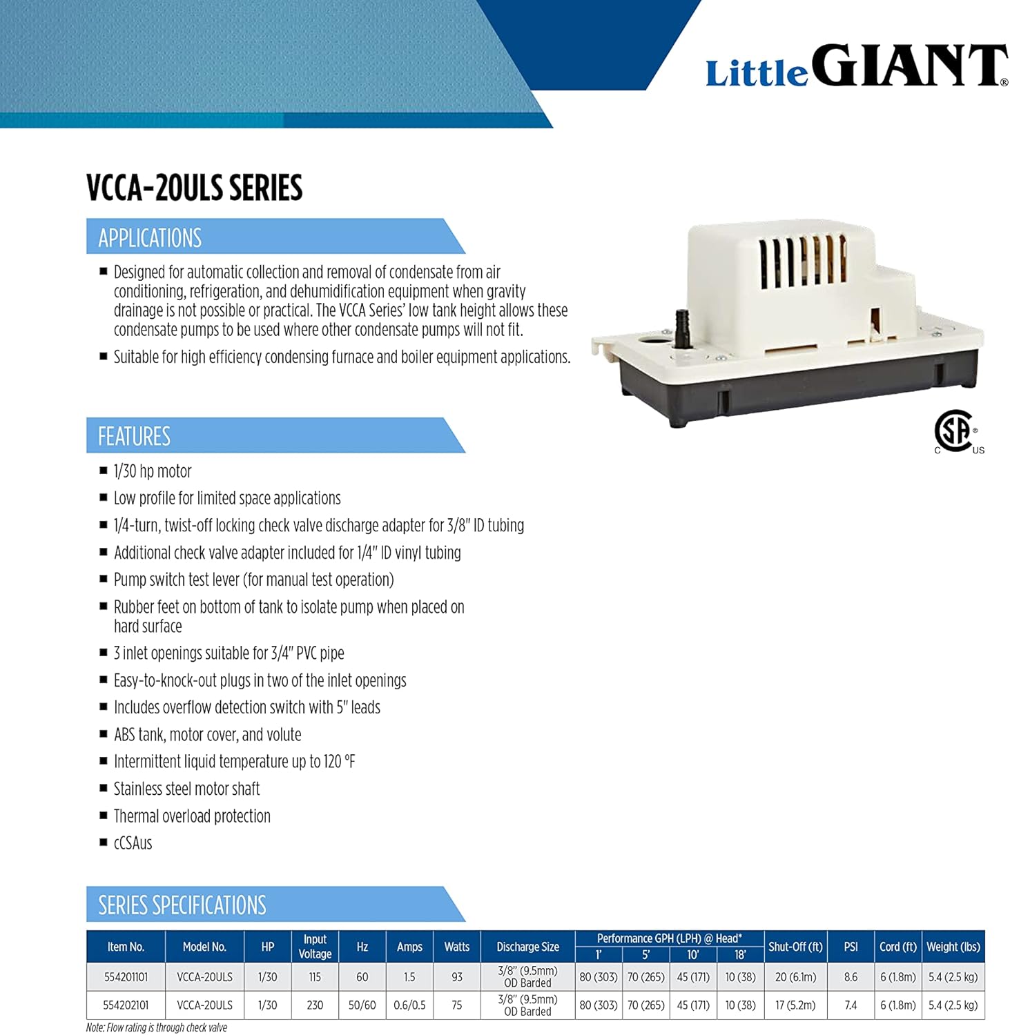 The Little Giant VCCA-20ULS 115-volt, low-profile condensate pump is suited for tight spaces. The dimensions are 11.96" long x 5.2" wide x 5.23" high. It is designed to removed condensate from air conditioners, refrigerators, dehumidifiers, boilers and furnaces. This pump comes with a safety switch which can be wired to shut down the system if an overflow situation is detected or it can be wired to activate an audible or visual alarm (not included.). This pump comes with a 6' cord and 3-prong plug. This pump is UL listed in Canadian and the USA.The VCCA-20ULS delivers up to 80 gph with a 17' shut-off and maximum of 7.4 PSI. It can handle intermittent liquid temperatures up to 120 °F. The VCCA-20ULS has 3-inlet openings suitable for 3/4" PVC pipe. Rubber feet on the bottom of the tank reduces noise when place on a hard surface. This pump comes with a switch test lever. It is equipped with a 1/4-turn, twist-off locking check valve discharge adapter for 3/8" ID tubing and an additional check valve adapter is included for 1/4" ID vinyl tubing.