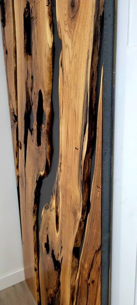 Designed and built by CALA Contemporary Woodwork. These sliding doors are definitely a statement piece. Say goodbye to outdated barn doors and hello to this sleek, modern sliding door made from live edge black walnut slabs on dark stained maple surrounded with a raw metal frame. These doors are 36"x 84" but we can customize measurements upon request. We can also build them using different wood species; just ask. ******Back of doors are solid, not the same pattern as the front****** It can be: ebony, white or natural maple. double sided pattern can be done upon request, at an extra cost. Your door will not be the exact door in the picture. Each item is made to order and 100% handcrafted making it completely one of a kind. **Hardware not included. **These doors do not have epoxy