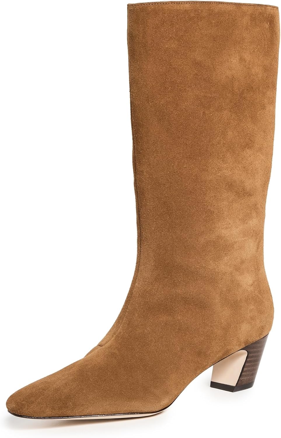 Mid-heel calf boot in brown split suede. Features a padded footbed with gold stamped logo. 2-inch heel.