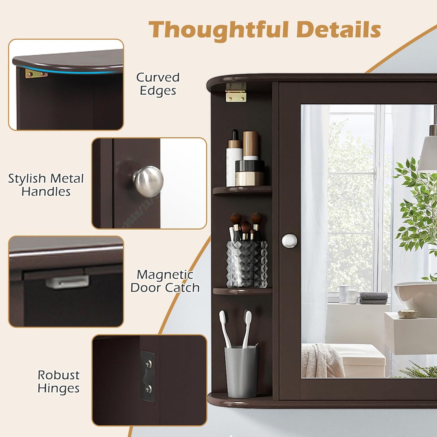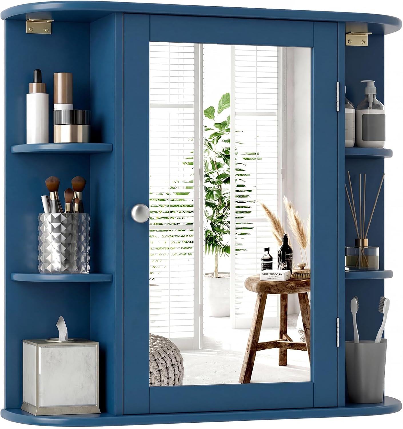 Description: Transform your bathroom into a well-organized sanctuary with the bathroom wall cabinet! Equipped with a combination of 6 open shelves and 4 enclosed tiers, the hanging medicine cabinet provides quick access to frequently used items and provides a discreet storage solution for personal essentials, the bathroom medicine cabinet offers spacious storage space for frequently used essentials, like towels, aromas, cosmetics and toiletries. By affixing it to the wall, the storage cabinet eliminates the need for precious floor space, making it an ideal choice for both compact bathrooms, laundry rooms, entryways. Exquisite details make a difference! The inclusion of a high-definition mirror adds a touch of convenience to your daily routine, allowing for effortless makeup application. Features: Large HD mirror reflects your makeup and style clearly 6 open shelves and 4 enclosed tiers provide easy access for ample essentials Wall mounted design will optimize your wall space efficiency Sleek metal handle and fan-shaped shelves add a touch of style Magnetic catch ensures smooth opening and closing Applicable to bathroom, entryway, hotel, garage, living room, kitchen or laundry room Assembly needed Specifications: Color: White/Brown/Grey/Black/Blue Material: MDF Overall Dimensions: 26" x 6.5" x 25" (L x W x H) Open Compartment Size: 5" x 7.5" (Radius x H) Internal Shelf Size: 14" x 5" (L x W) Internal Shelf Spacing: 5.5" Weight Capacity of Top: 44 lbs Weight Capacity of Each Shelf: 11 lbs Net Weight: 21 lbs Package Includes: 1 x Bathroom Wall Cabinet with Mirror 1 x User Guide