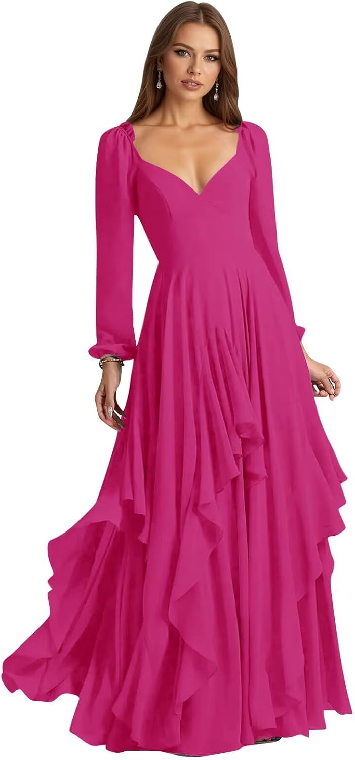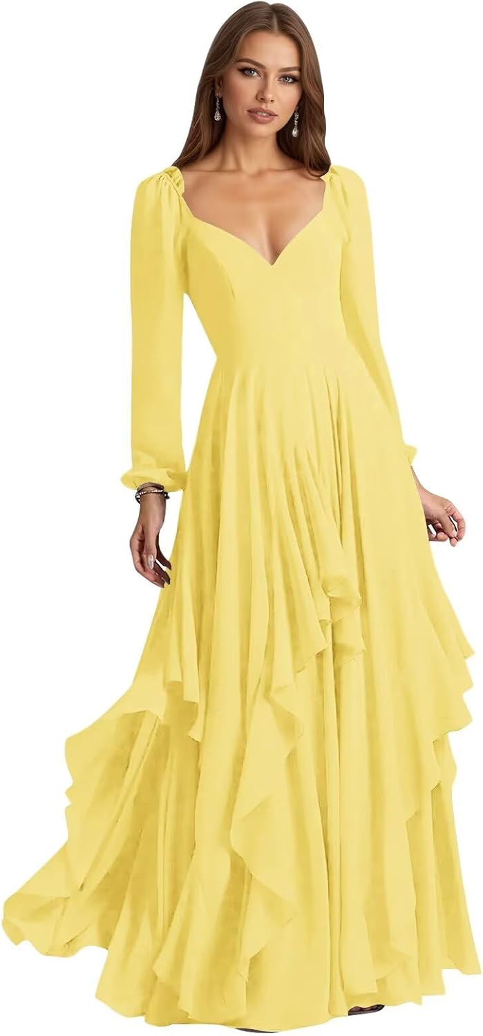 Long Sleeve Bridesmaid Dresses for Women V Neck A-Line Chiffon Ruffles Pleated Corset Wedding Guest Dresses