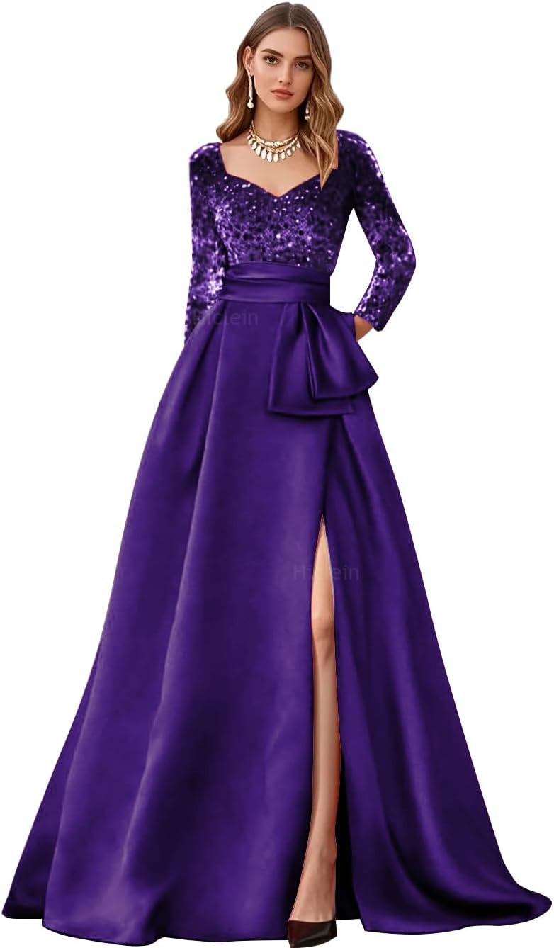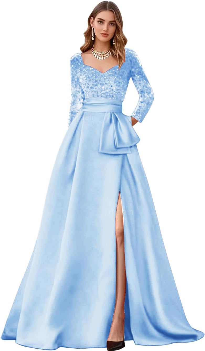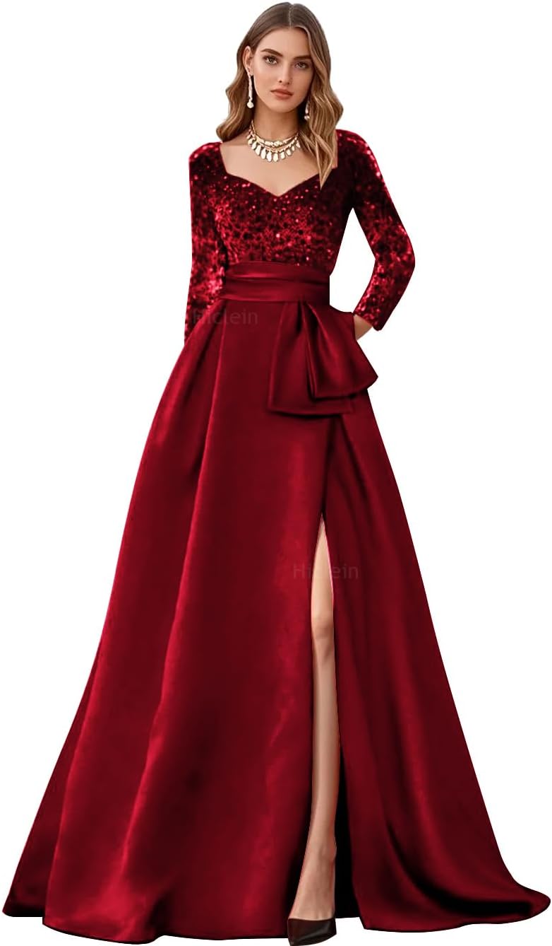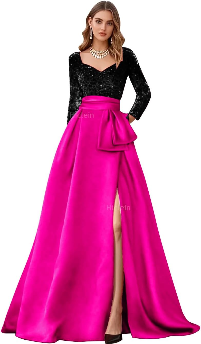 | Fabric Type | Fabric:Sparkly Sequin Satin Formal Prom Dresses Long Sleeve Ball Gowns with Slit Square Neck A Line Evening Gown with Pockets |