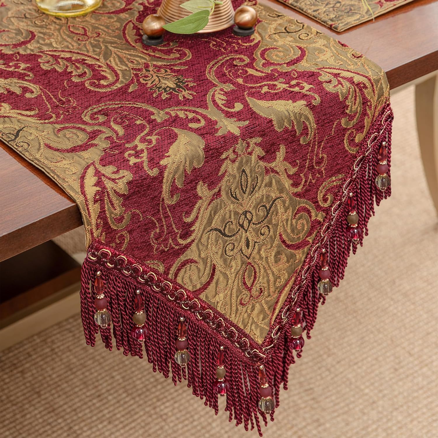 Loom and Mill Luxury Table Runner 72 inches Long Bundles 4 PCS Damask Jacquard Table Place Mats. This dining table runner and place mat set features handmade multi-tassels & double-layer Design with classic traditional jacquard pattern, perfect for kitchen room dining table dresser party banquet decorations.