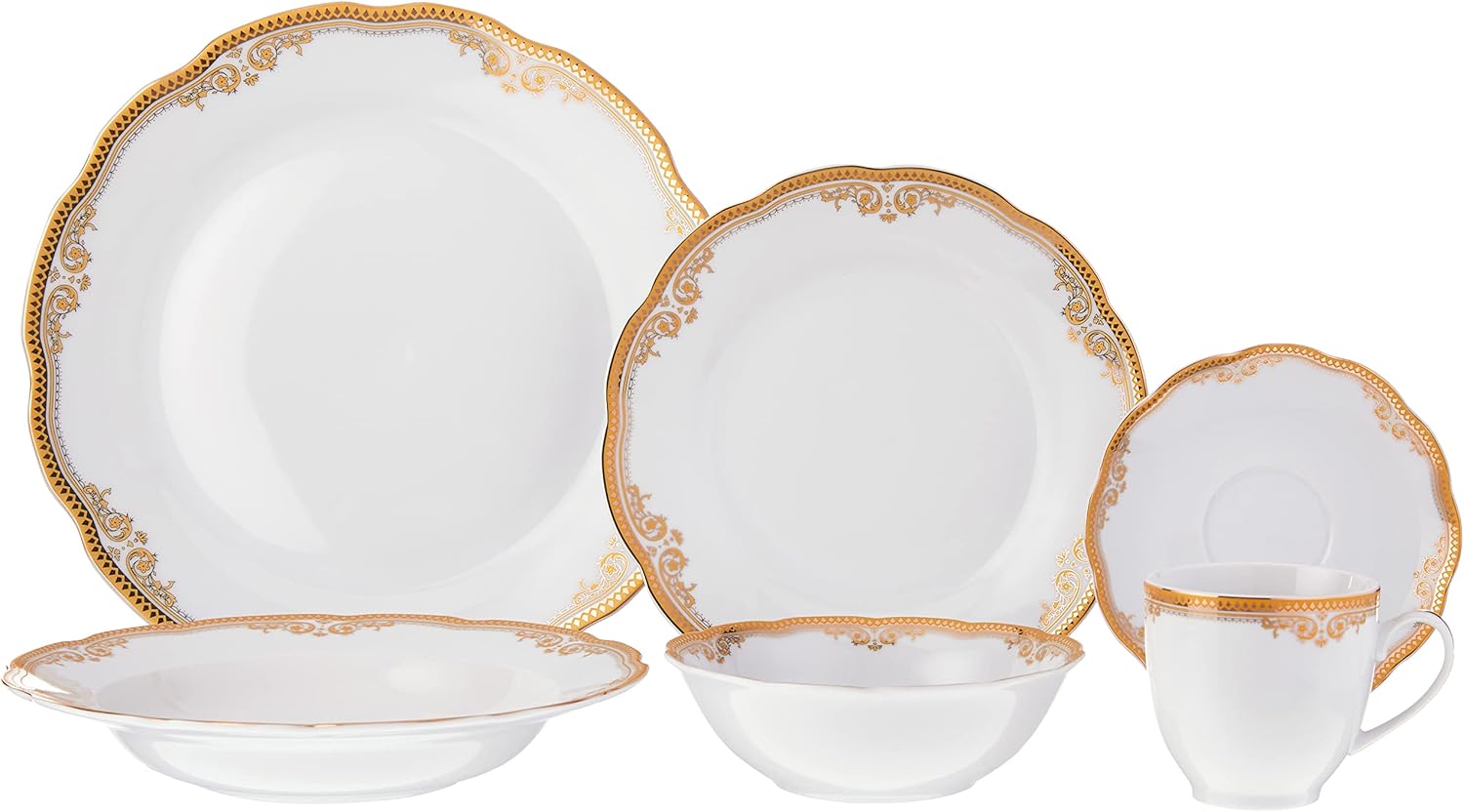 This 24 piece fine wavy edge porcelain dinnerware set is a complete service for 4. This set features a wavy edge with an elegant and stylish gold border trim design. Made of fine and durable porcelain. Great for everyday use or elegant enough for a special occasion. Set includes 4-10.5" dinner plate, 4-8" soup plate, 4-7" salad plate, 4-7 Ounce Coffee cup and 4-Saucers, 4-5.5" fruit/cereal bowl. Dishwasher safe.