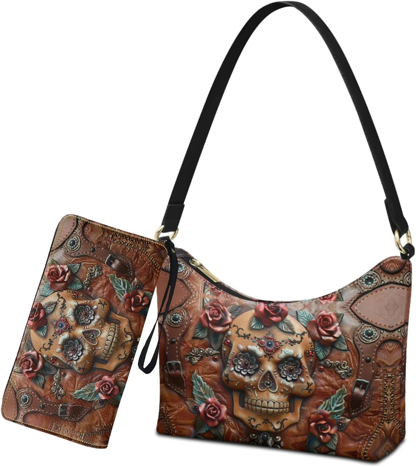 This women's shoulder bag and wallet set contain 1* shoulder bag and 1* wallet. Women’s shoulder bag is made of supple PU leather; Wallet is made of PU leather; Feels comfortable against your skin, lightweight and easy to carry with and hold on. Women’s shoulder purse measuring at 9.45 x 2.95 x 7.68 inches; Wallet measuring at 7.9 x 1 x 4.3 inches; Shoulder bag wallet set are compact and fashion in appearance while providing ample space to hold your mobile phone, wallet, cash, cards, lipstick, sunglasses, and keys and other daily items. Keep your things safe and organized; Ladies' shoulder bag and wallet with a smooth zipper to keep items secure; Shoulder Purse inner a handy pocket keeps smaller items like keys or cards separate and easy to find; Strong metal rings mean the hand strap stays securely attached; Protable wallet with a PU wristband, easy to carry with and hold on; In addition, inside has 4 card slot, 2 large compartments and 1 zipper coin pocket, easy to classify and store items. Our handbag and wallet set provide a variety of vivid patterns for you to choose, match your outfit look, accessory for woman on the go; Meanwhile, ashionable and unique pattern design adds a touch of color to your wardrobe. Our shoulder bag wallet combo is suitable for work, shopping, party, travel, hiking, camping and so on; And it’s also a perfect gift for mother, wife, girlfriend in mother’s day, valentine’s day, birthday, Halloween, Christmas or other important days. Note: 1.Please allow a little error in the length (usually 1 to 2 cm)due to different measurement. 2.Please allow a little difference in the color due to different display environment.