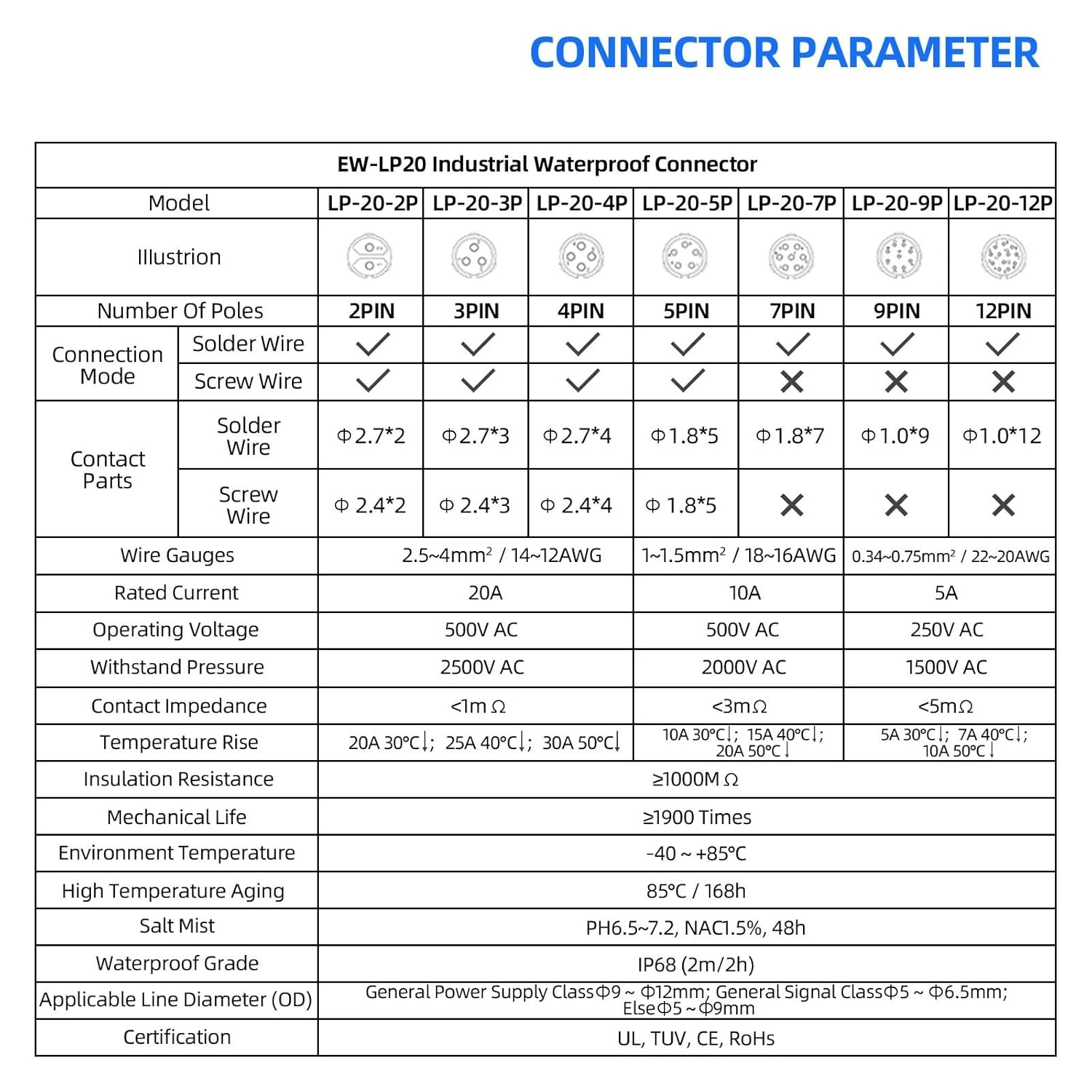 Connectors==========Hign-concerned Chemical : NoneModel Number : EW-LP24-Female & Male DIY Supplies : ElectricalOrigin : Pairing Type: : Male + Female Protection Level: : IP68(2m/2h)(Mated)Assembly Style: : SolderContact Core: : Copper Alloy (Gold Plated)Shell Material: : High Performance PBT Plastic MaterialConnecting Mode: : One-Touch Button Plug/UnplugDurability: : 1900 Mating/Unmating CycleLocking Method: : Automatic Insertion, Self-Locking DeviceTemperature Range: : -40°C ~ 80°CHigh Temperature Aging: : 85 / 168 HFlame Retardant Grade: : UL94 V-0