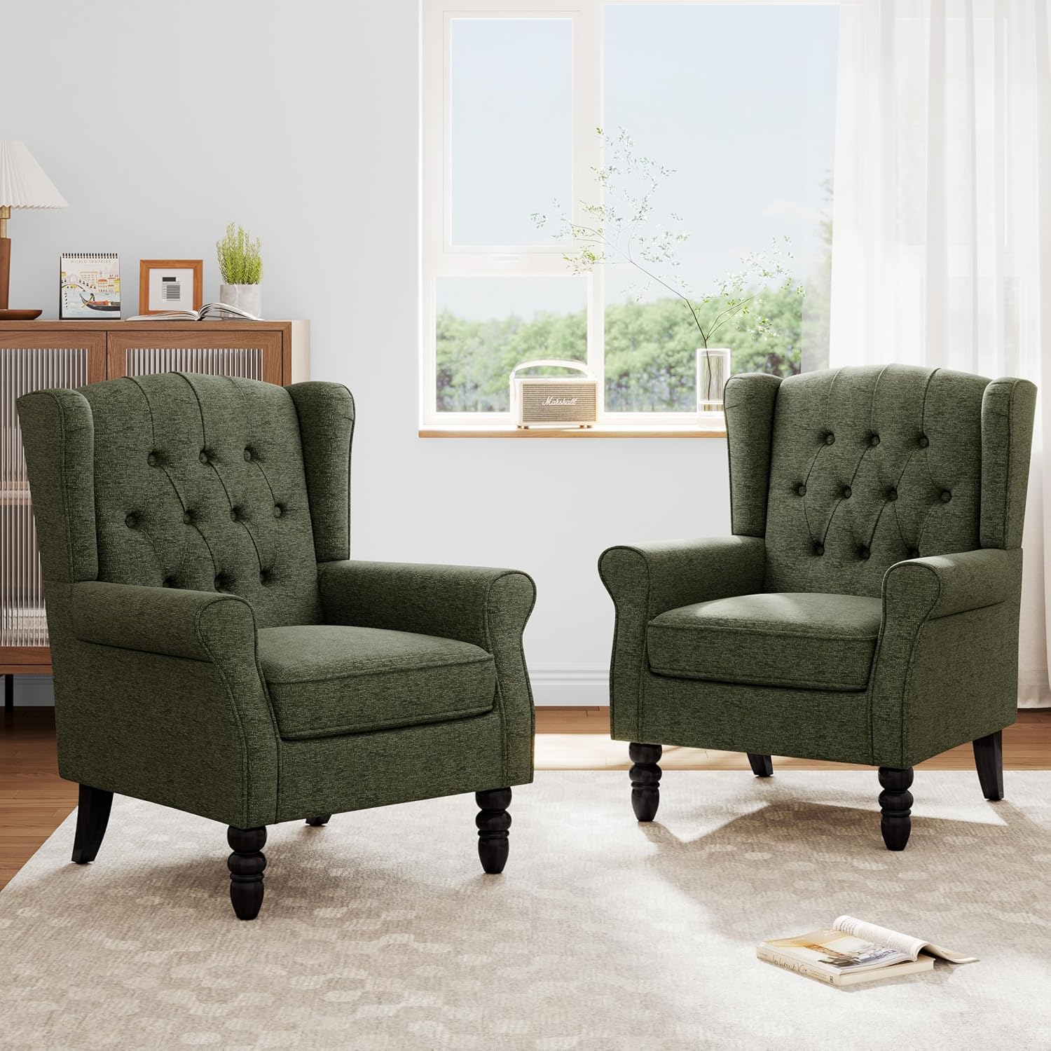 Color: Beige, Light Gray, Gray,Taupe,Brown,Green,Black Blue Main Material: Solid Wood, Sponge, Linen Fabric Type: High Back Accent chair; Armchair; High back accent chairs with arms; Accent Chair; Wood Chairs; Arm Chairs; Comfy Upholstered Armchair; Nailhead Trim Living Room Single Sofa Note: Accent Chair X 1, Arrives in 1 box Please feel free to contact us if there are any missing parts or quality issues about the products