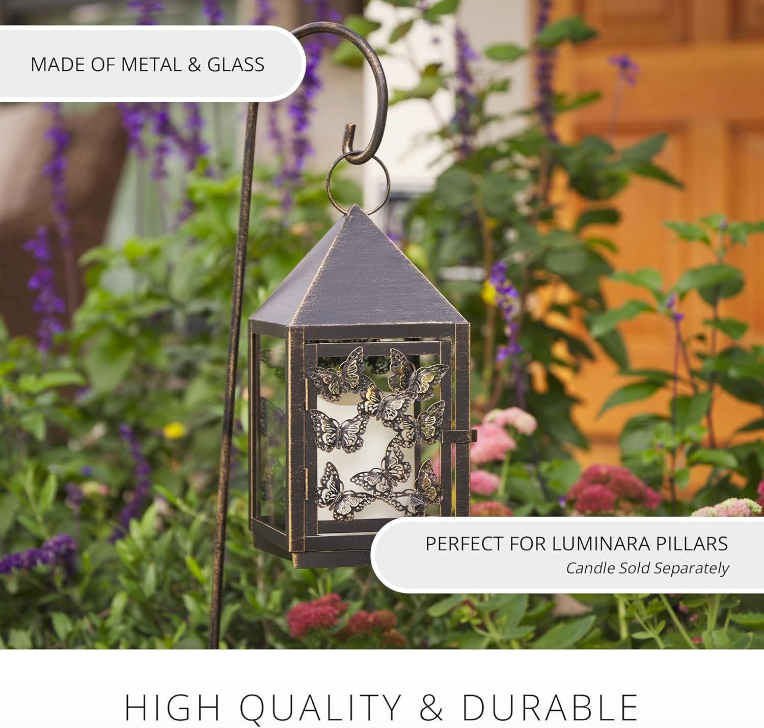 Transform your garden with the enchanting Luminara Butterfly Lantern. This elegant piece features a 6" wide base and extends 11.5" from hanging ring to bottom edge. Constructed with premium materials - metal and glass throughout, with no plastic components. The lantern's open design and butterfly detailing create the perfect showcase for outdoor candles. For optimal lighting, use candles up to 6" in height. Compatible with both white and color-changing Luminara candles. This lantern requires no battery or solar power, relying solely on candle illumination. Not compatible with existing landscape lighting systems. Suitable for both indoor and outdoor use, these hanging lamps withstand typical weather conditions. For longevity, remove candle and store during severe weather events. Each lantern comes fully assembled and includes a 38" Shepherds Hook hanger. Flameless candles sold separately. Available in two sophisticated finishes: matte black and brushed antique bronze. Both options complement white or ivory Luminara candles beautifully. Features intricate butterfly lacework on the door and back, complemented by clear glass panels. Built with durable metal construction for the peaked roof, base, and frame. Simple assembly of the Shepherd's Crook hanger - just slide pieces together and insert the double-tined base into soil. Hang lantern from the curved end using the attached ring. No tools needed to create your perfect outdoor sanctuary. Adds cottagecore charm during daylight hours and creates magical ambiance at night. Ideal for outdoor decorating enthusiasts, regardless of style preference - from classic to coastal to whimsical. Designed specifically for use with Luminara's patented flickering flameless candles.