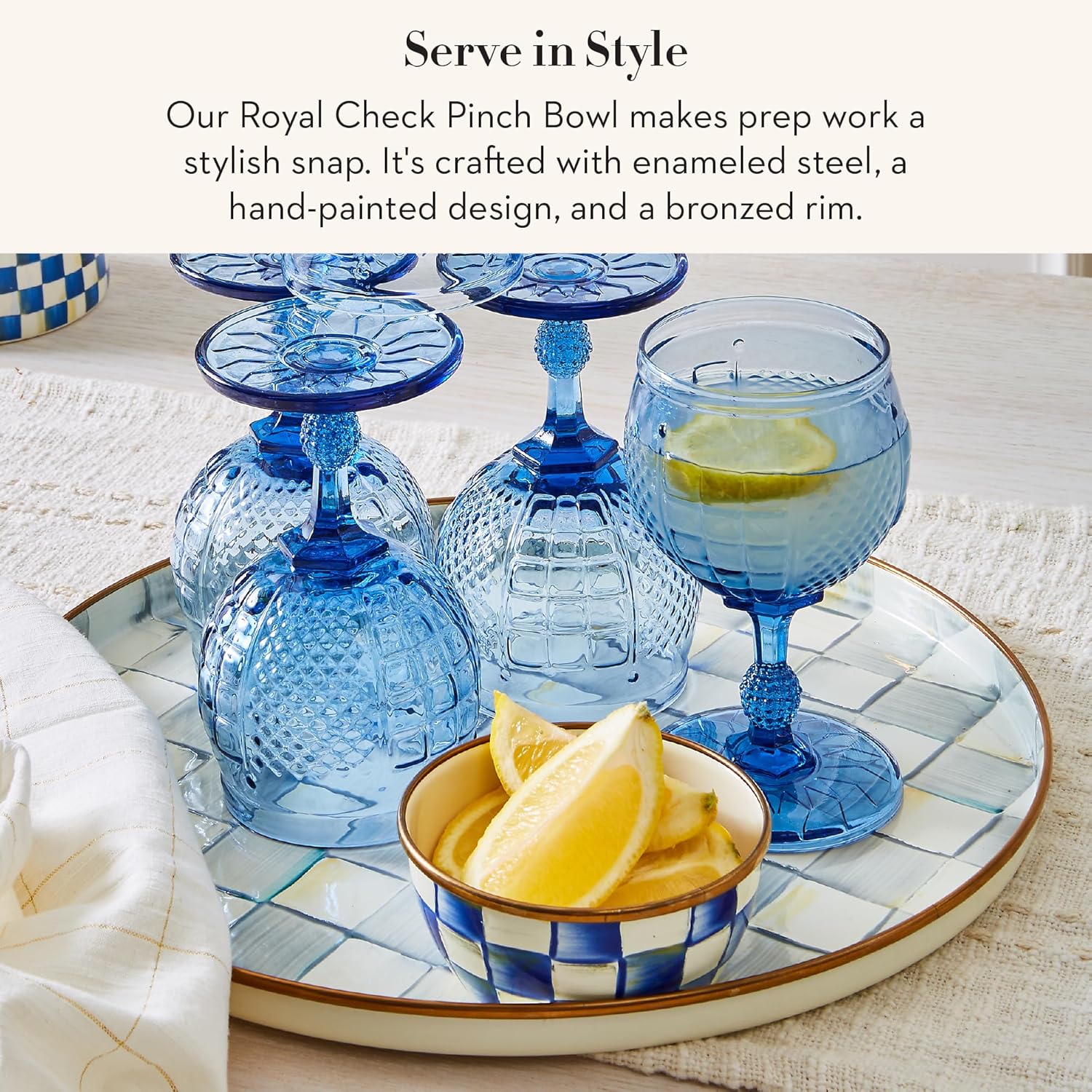 The MacKenzie-Childs Enamel Pinch Bowl is a versatile addition to your dining essentials. For masters of mise en place, this single serving bowl for sides or holder for ingredients makes prep work a stylish snap. With its just-right size and our signature pattern, this pretty bowl is equally charming when brimming with paper clips in a home office, lemon wedges on the wet bar, or sauce for sushi at home.This small decorative bowl features our hand-glazed signature pattern woven by an artisan’s brush, making it perfect for pairing with any food or color. Created with just the right pinch of style, it matches the other kitchen tools and dishware in our collections, including tea kettles, dinner bowls, serving dishes, plates, and more. Take a look at our other kitchen items to create a magnificent MacKenzie-Childs menagerie!You’ll never have to guess what to get for a housewarming gift now that you’re a part of the MacKenzie-Childs family. Our artisan-designed home decor is the perfect gift for any special person in your life. Since 1983, our talented designers and artisans have created beautiful original tableware, furniture, home and garden accessories, and more that add joy and grace to homes great and small throughout the world.Care instructions: For best results, hand-wash with mild soap and dry immediately. Do not microwave. Materials: Hand-glazed steel underbody with a hand-painted or hand-applied decoration. Dimensions: 4.5" dia. x 2" H; 1.5-cup capacity. Pieces may vary due to the handmade nature of each product. Imported. Our enamelware exceeds both federal food-safety regulations and California’s Proposition 65, the strictest environmental safety standards in the United States. Handle enamelware with care and discontinue use for food service if it becomes chipped, cracked, or broken.