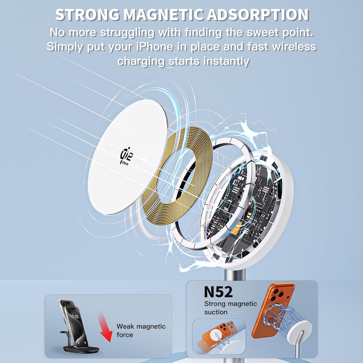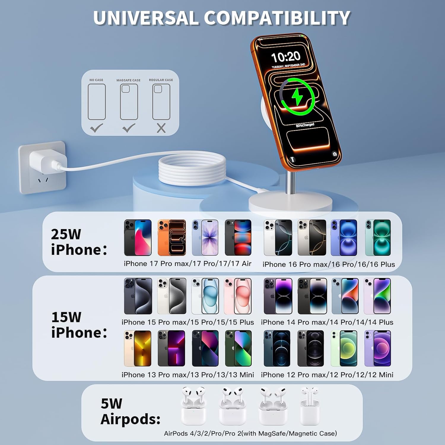25W Fast Magnetic Charger Stand - Designed for iPhone 17/16/15/14/13/12 Series-Non-slip surface ensures that your device stays in place during charging, ideal for home, office, travelling.-It provides fast and reliable power supply, easy to put in your bag.-Mgsafe Carger Stand say goodbye to clutter and hello to efficiency. A thoughtful gift for your loved ones/friends.Magnetic Alignment Charging & Strong MagneticThe Magnetic charger stand is equipped with an upgraded N52 strong magnet that can automatically and firmly align the iPhone.You're free to work, play games, watch movies, listen to music, or do whatever you might need to do while charging your iPhone.Friendly Reminder1.It is equipped with a non-slip surface and case-friendly compatibility, which supports cases with a thickness of ≤ 0.15 inches (3.8mm).2.Please avoid cases with metal rings, pockets, or magnets.3.It helps to keep devices organized and charged while enhancing any room or office with its sleek appearance.Wide Compatibility25W Fast charging for iPhoneiPhone 17 Pro Max/17 Pro/17 Air/17iPhone 16 Pro Max/16 Pro/16 Plus/16iPhone 15 Pro Max/15 Pro/15 Plus/15iPhone 14 Pro Max/14 Pro/14 Plus/14iPhone 13 Pro Max/13 Pro/13/13 miniiPhone 12 Pro Max/12 Pro/12/12 miniAirPods 4/3/2/Pro/Pro2Package included1*25W charging station apple1*35W PD Fast Charging Plug1*60W USB C to C Cable (3m/10FT)