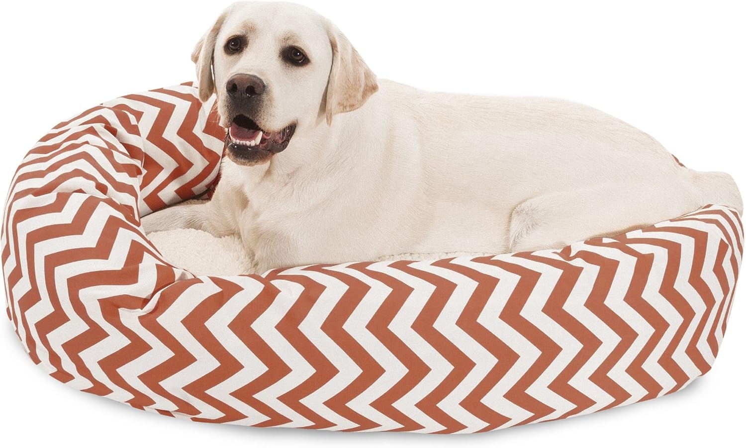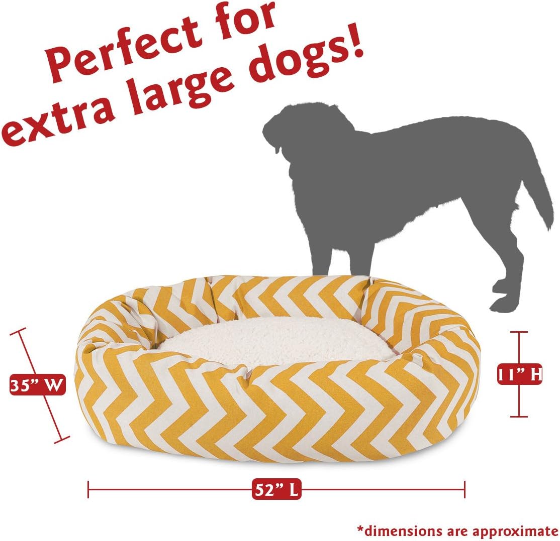 Majestic Pet Product 52" Chevron Extra-Large Bagel Style Dog Bed with Sherpa Center Outside Dimensions: 52"L x 35"W Inside Dimensions: 46"L x 30"W Bolster: 14"H Cushion: 10"H Outside material: Outdoor treated polyester, sherpa center Inside material: Premium High Loft Polyester Fiber Fil Washing Instructions: Place entire dog bed into washer and dryer on gentle cycle, air dry We, at Majestic Pet Products, agree with you: comfort is a must have when taking care of dogs and pets, no matter their age or size. Recovery is a big part for the dog to stay healthy and increase longevity. And that's why we offer a super comfortable round-shaped pet beds, available in FOUR different sizes. All in soft, comfortable construction for their maximum comfort. It is made with stable design on soft durable cotton / polyester material that is easy to clean and maintain. The Majestic Pet Bagel Dog Bed is available in five different sizes: Small: 24" x 19" x 7" -- Dogs 10 to 25 lbs. recommended Medium: 32" x 23" x 8" -- Dogs 25 to 40 lbs. recommended Large: 40" x 29" x 9" -- Dogs 40 to 70 lbs. recommended Oversize: 52" x 36" x 14" -- Dogs 70 to 110 lbs. recommended