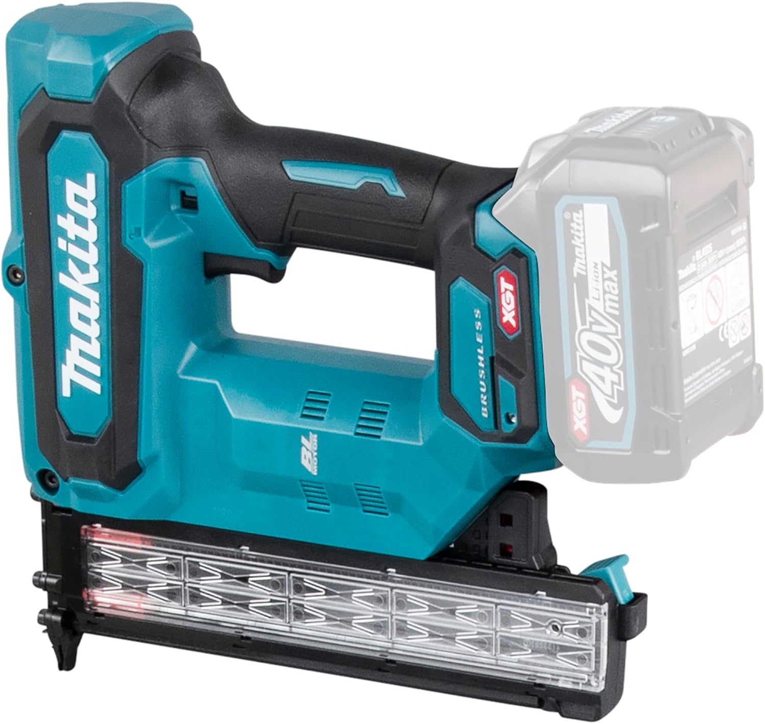 Powerful cordless compression head nailer is used for quick and easy attachment of decorative strips, skirting boards and textiles. Different pin lengths from 15 to 40 mm can be used, 18ga. Thanks to the exit in the middle of the contact plate, a particularly precise setting of the nails is possible. One BL4025 battery charge is enough for up to 5,000 nails. ; Specifications: Compact and handy design; Deep discharge protection. The device automatically switches off when the battery is almost empty. Technical details: battery voltage 40 V max. Battery system XGT; battery protection system; weight including battery (EPTA) 2.6 - 3.2 kg; product dimensions (L x W x H): 234 x 86 x 243 mm; battery type (Ni-Cd / Li-ion) Li-ion; pin length 15, 20, 25, 30, 35, 40 mm; gauge 18 Ga; magazine capacity 100; Sound power level (LWA) 92 dB(A); sound pressure level (LpA) 81 dB(A); K value noise 3 dB(A); vibration ≤ 2.5 m/s²; K value vibration 1.5 m/s²