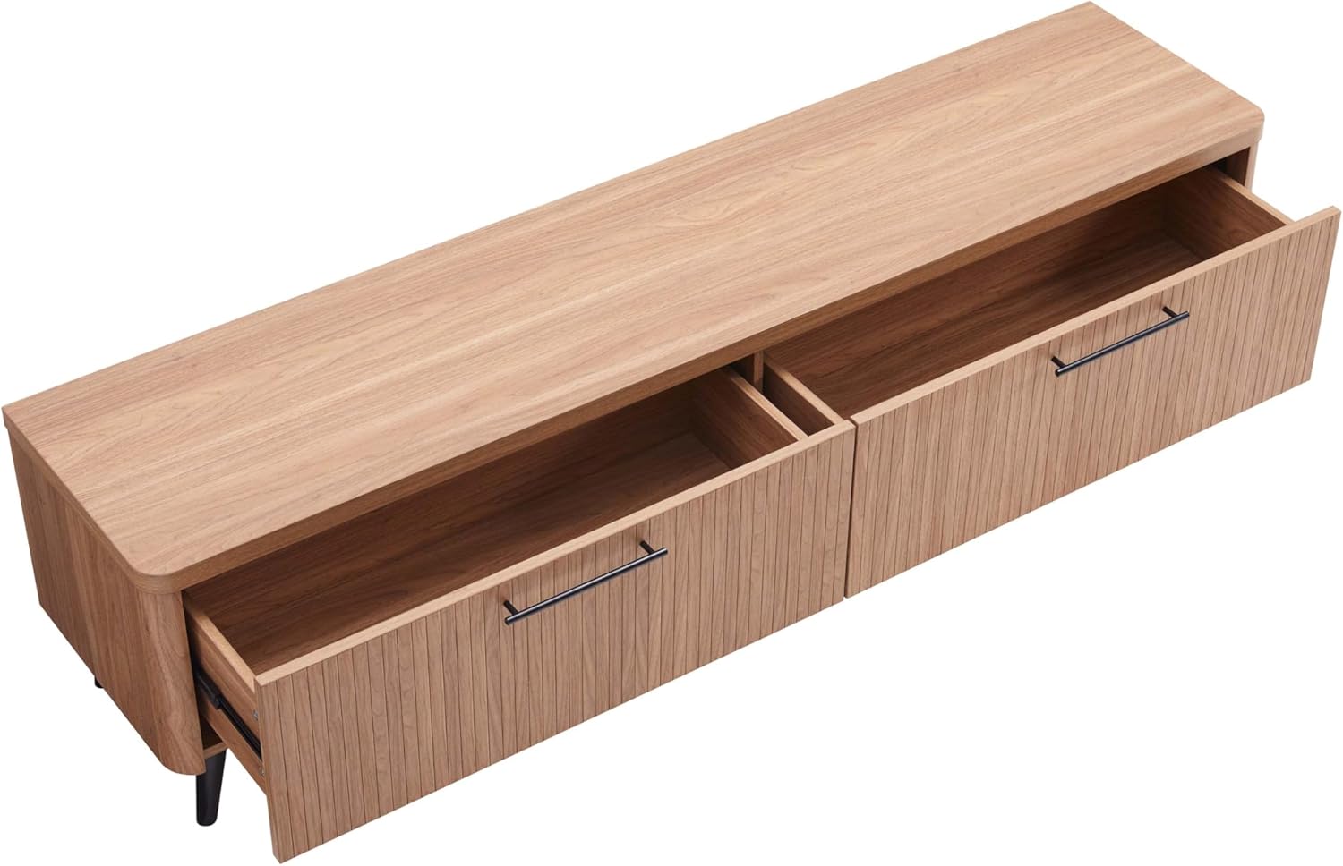 Elevate your living space with the stunning Mid-Century Modern Jodie 68.9" TV Stand, a perfect blend of style and functionality. Crafted from premium manufactured wood, this TV stand showcases exquisite wood ribbed drawers and doors that add a textured sophistication to your décor. The beautiful wood grain finish enhances its overall appeal, making it a timeless addition to any room. Designed with convenience in mind, the Jodie TV Stand features two spacious ribbed storage drawers that provide ample space for your media devices, games, and entertainment essentials, ensuring your living area remains clutter-free.The sleek black metal handles perfectly complement the overall design, while the splayed metal legs add a touch of elegance and durability, ensuring stability for your television setup. This versatile piece is recommended for TVs up to 75 inches, making it an ideal centerpiece for movie nights or gaming sessions with family and friends. Assembly is a breeze, as all necessary hardware is included, allowing you to enjoy your new furniture in no time.Whether you're a fan of Mid-Century Modern design or simply looking to refresh your living room, the Jodie TV Stand seamlessly blends modern nostalgia with contemporary flair. Transform your home into a stylish sanctuary where elegance meets practicality, making every viewing experience enjoyable and stylish.