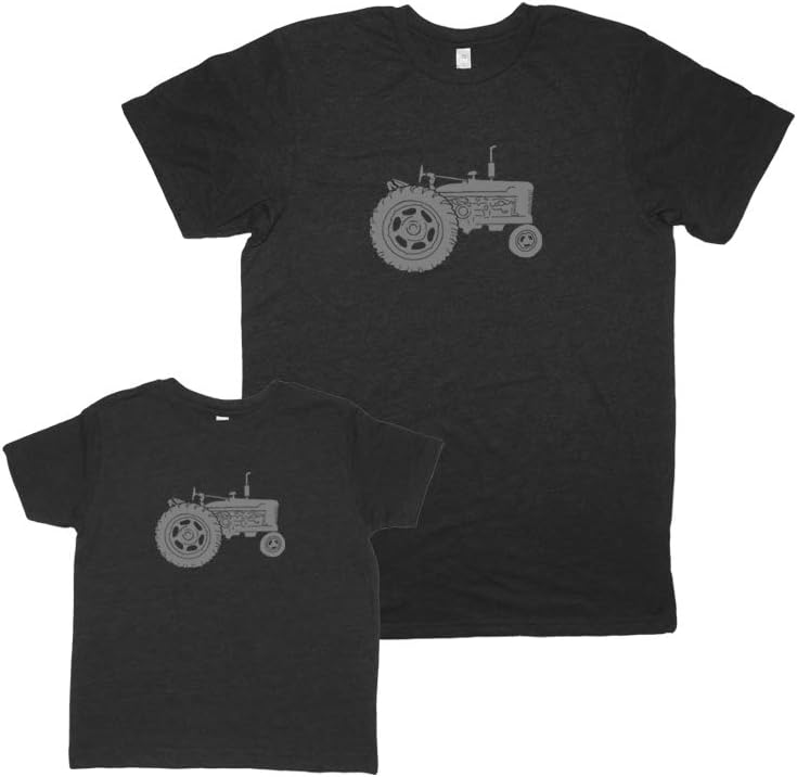 This is a set of incredibly soft, blended poly-cotton, awesome matching shirts for father and son. The fabric has a heather look that creates a retro style with a vintage feel. These soft and durable shirts are pre-shrunk. Our original tractor farming design is printed by hand at our family-owned studio using eco-friendly inks for a soft-feeling, long-lasting print. This gift set would make the perfect Fathers Day gift or daddy's birthday gift from his son. Great birthday gift idea for your husband, dad, or grandpa to match with your son.