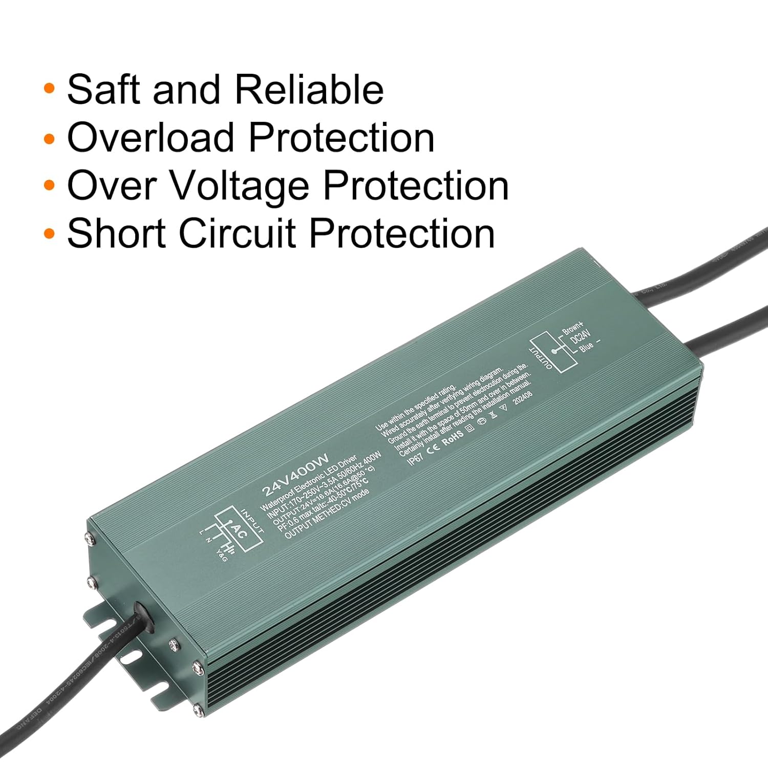 What is this?An LED driver is a device that provides power and regulates the current flowing through an LED (Light Emitting Diode) lighting system. LED drivers are essential components in LED fixtures as they ensure that the LEDs receive the correct voltage and current to operate efficiently and maintain their lifespan. What will I get?Material: Aluminum AlloyColor: Army GreenInput voltage: 170V-250V AC Output voltage:24V DCOutput current: 14.6AOutput power: 350WCooling Type: Natural CoolingWaterproof Level: IP67Size: 258x76x38mm / 10.16x2.99x1.50 inchIn the package of: 1 x LED DriverAre there any advantages of the product?Waterproof and Dustproof: IP67 highly effective waterproof, internal glue filling design, make this LED driver waterproof, dustproof and durable, can easily meet the needs of outdoor use.Multiple Protections: This LED light strip power supply has multiple safety protection functions, which can provide overload protection, over voltage protection and short circuit protection to ensure that the LED strip light works stably and safely.High Efficiency and Stability: The LED driver effectively converts electrical energy into light energy, provides stable current and voltage output, ensures the LED light strip works stably and prolongs its service life.How to use it?After connecting the LED light strip to the LED driver and connecting the LED driver to the AC power, make sure the positive and negative poles are connected correctly.What should I notice?1. The LED driver is NOT dimmable2. During the circuit connection process, please keep the power off.