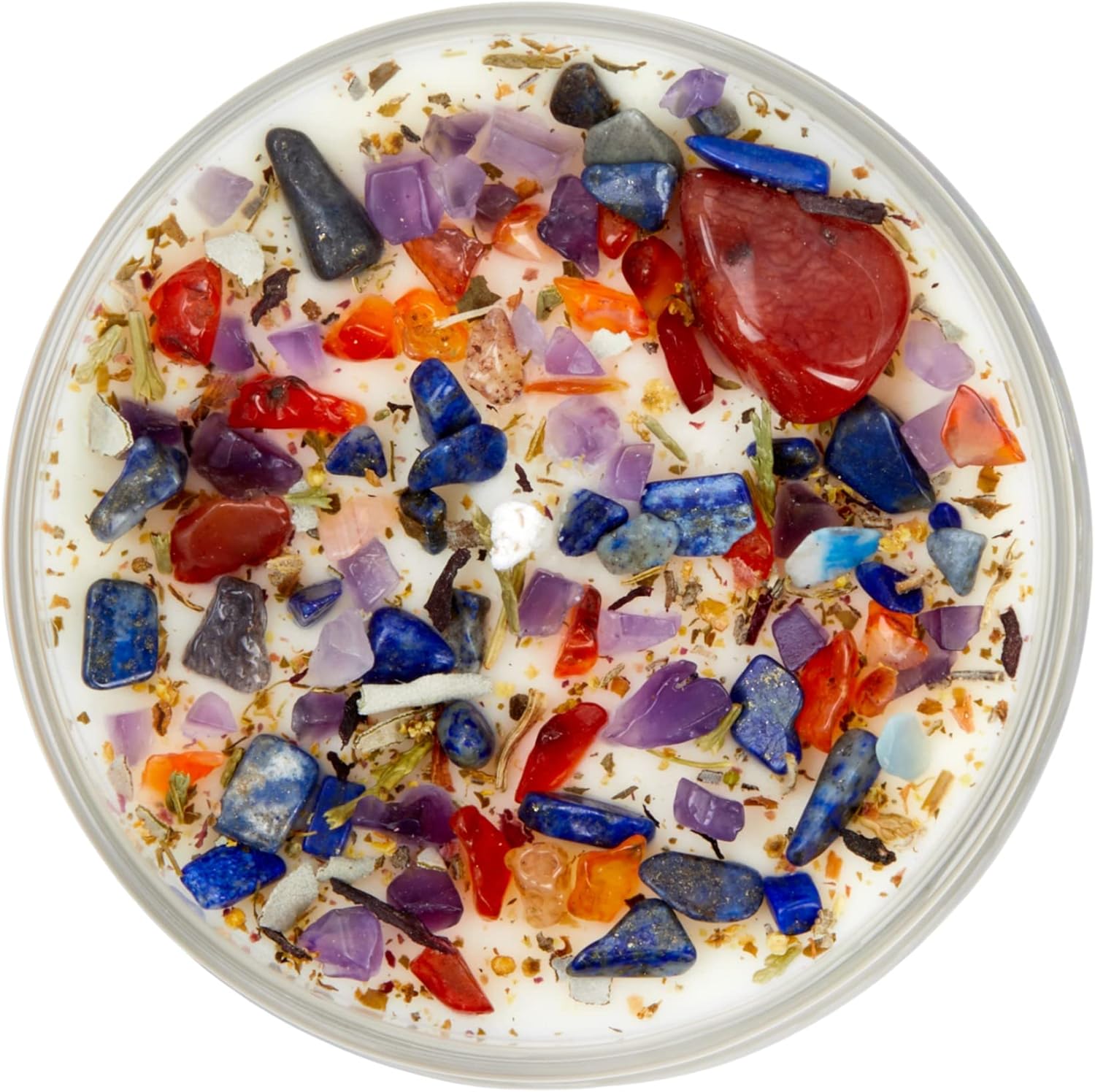 The New Moon Beginnings Meditation Candle is our interpretation of the famous Nag Champa scent. It is made to help clear negative energies and create a calm and relaxing environment and is perfect for meditation. It helps to remove barriers and blockages in your life, gain clarity, and boost strength. If serious obstacles are holding you back, use Meditation combined with this Candle to break through those walls and clear a new way forward. The Meditation Candle has a Woody, Warm, Sweet, and comforting scent with Carnelian, Lapis Lazuli, and Amethyst healing crystals on top. Handmade and Hand-poured with Soy Wax for a Long, Clean Burn!This listing is for a single (1) New Moon Beginnings Candle container or pack of tealights. New Moon Beginnings Candles are Handmade and Hand-poured in the USA. We use 100% Natural Soy Wax, Essential oils, Natural Fragrance Oils, and 100% Cotton Wicks (Lead-Free). Each candle is topped with Genuine Crystals and Stones, flowers, and herbs which are all mindfully selected to help set the intention of the candle.Size Options include: Tealights in a set of 6: Each Tealight is .75" tall and 1.5" in diameter7.5 oz. Glass Jar: 3 inches high and ~2.75 inches in diameter8 oz. Tin with lid: 2 inches high and ~3 inches in diameter12 oz. Glass Jar with lid: 3.5 inches high and ~3.25 inches in diameter21 oz. Glass Jar with lid: 6.25 inches high and ~3 inches in diameterBURN TIMES: Tealights: 4 to 6 hours per tealight7.5 oz: 20 to 30 hours8 oz: 20 to 30 hours12 oz: 40 to 60 hours21 oz: 80 to 100 hours