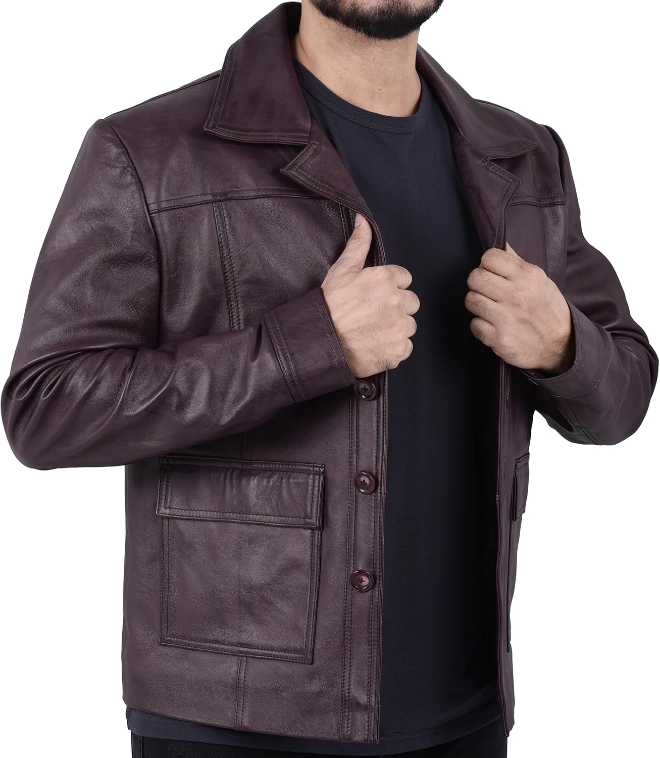 ✔The DURVANE Men's Burgundy Leather Jacket will enhance your appearance with its timeless blend of sophisticated style and robust appeal. Made completely of genuine sheepskin leather, this jacket exudes excellence with its smooth, polished finish. Its deep burgundy color is perfect for making a big statement while maintaining a classic charm. You can stand out in any setting thanks to this jacket's button-up construction and notch lapel collar, which combine traditional flair with modern functionality. Whether you're going out on a more casual date or dressed up for a formal function, this jacket adds flair to any outfit.well-considered features combine functionality and style. The jacket's two roomy front patch big pockets give a functional yet fashionable touch to its overall design while offering plenty of room for storing your belongings. The slim-fit design offers a comfortable and attractive fit while enhancing your silhouette. Because of the superior craftsmanship that guarantees longevity, this jacket will be a dependable friend for many years to come. Its adaptable style goes well with both formal and casual settings, making it a wardrobe staple for any modern guy.Let you transition into comfortable, carefree style. The internal 100% polyester lining keeps you toasty in the winter, while the plush sheepskin leather guarantees a smooth and supple feel. This jacket is the ideal addition to your lifestyle, whether you're riding a motorcycle, going to a party, or just walking around the city. It is perfect for those who value upscale fashion with a tough edge because of its striking color and elegant design. Experience the ideal harmony of design, craftsmanship, and usefulness by adding this classic item to your wardrobe collection.