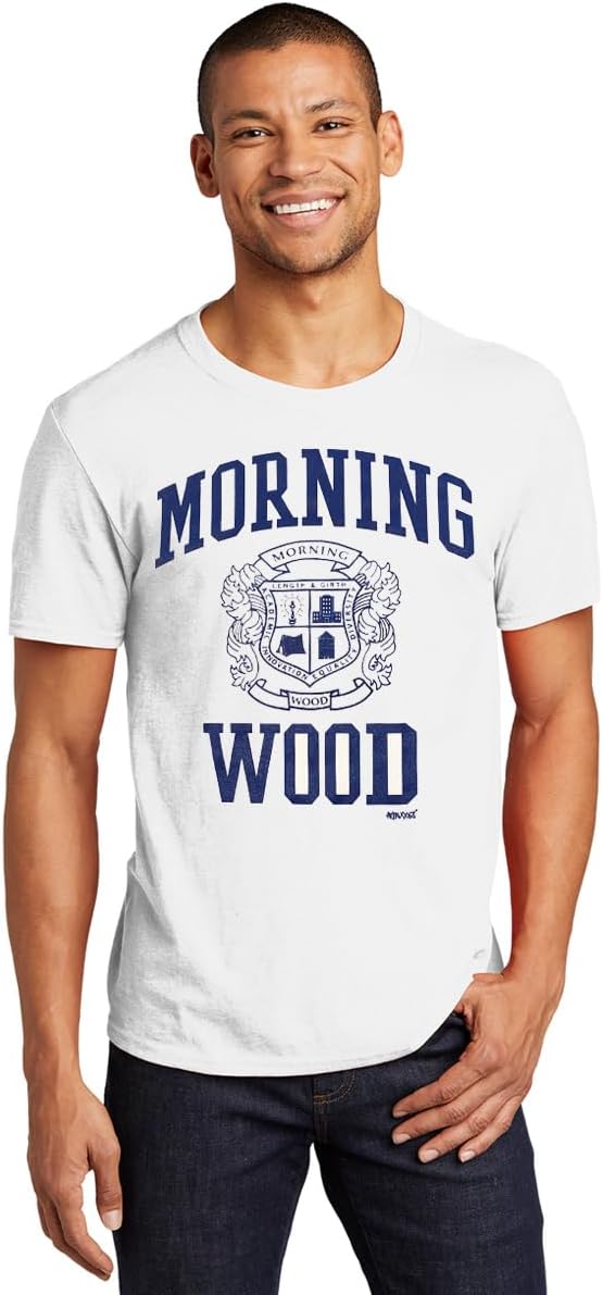 From our Heritage Collection. One of our signature designs updated for all you naughty guys out there. Morning Wood prep school T-shirt. Navy silk-screened graphic on a white, lightweight, great fitting premium 100% cotton T-shirt.