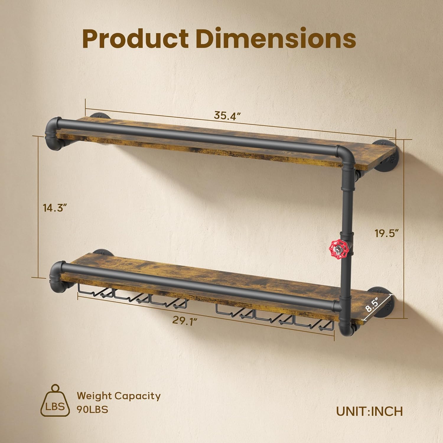 Merapi Industrial Wall Wine Rack: Where Rustic Charm Meets Modern Entertaining Transform that blank wall into the heart of your home’s social life. The Merapi Industrial Wall Wine Rack isn't just a storage piece—it’s a statement of style and a functional centerpiece designed for those who appreciate authentic craftsmanship and smart design. A Design That Speaks Volumes: Industrial Elegance, Refined We believe utility can be beautiful. Our designers have reimagined classic industrial piping, fusing it with the warmth of solid wood to create a structure that is both rugged and refined. The signature element? Our integrated dual-glass holder – a sleek, unified rack that cradles your stemware securely, eliminating the cluttered look of add-on hooks. This seamless blend of black metal and rich wood grain delivers an aesthetic that enhances farmhouse kitchens, urban lofts, and contemporary dining rooms alike. This is industrial design, perfected for your home. Engineered for the Collector & The Host More than a simple shelf, this is your ultimate 2-tier home bar command center. Smart, Multi-Level Storage: The upper tier showcases your prized liquor bottles or decorative accents, while the lower tier holds wine bottles within easy reach. The built-in glass rack keeps up to stemware glasses inverted, clean, and ready to pour. Built with Integrity: We use only high-grade, heavy-duty metal piping and thick wood planks. Every weld and joint is reinforced, ensuring unwavering stability for your valuable collection. The powder-coated finish resists wear and fingerprints, promising enduring beauty. The Space-Saving Solution: In kitchens, cozy apartments, or home offices, this floating bar shelf capitalizes on unused vertical space, freeing up counters and cabinets. It turns any underutilized corner into a functional display of your personality and taste. Your Lifestyle, Elevated Imagine the convenience of having everything for the perfect evening right at your fingertips. Whether it’s a spontaneous weeknight glass of wine, mixing cocktails for friends, or simply enjoying your collection as living art, the Merapi Wine Rack elevates the experience. It organizes, displays, and inspires. Ready for Your Story Installation is straightforward with all hardware included. In under 30 minutes, you can transform a wall and your entertaining game. It’s more than a purchase; it’s an upgrade to a more stylish, organized, and enjoyable home. Discover the Merapi difference—where every bottle has a place, every glass is on display, and every gathering begins with great design.