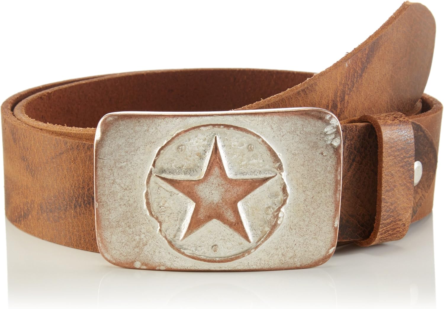 4 cm. Denim belt in high-quality, roughened cowhide leather with flat clasp. This belt with current star clasp rounds off any outfit perfectly. The high-quality leather becomes more beautiful and authentic the more it is worn. Can be shortened by the screw system.