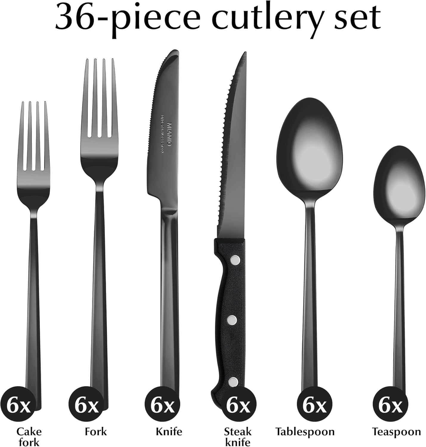 𝐏𝐑𝐄𝐌𝐈𝐔𝐌 𝐌𝐀𝐓𝐄𝐑𝐈𝐀𝐋 – 𝟏𝟖/𝟏𝟎 𝐒𝐓𝐀𝐈𝐍𝐋𝐄𝐒𝐒 𝐒𝐓𝐄𝐄𝐋 – The 36-piece MIAMIO cutlery set for 6 people is made of particularly high-quality 18/10 stainless steel. This premium material is completely rust-free, durable and specially designed for everyday use. The set contains 6 knives, 6 steak knives, 6 forks, 6 dessert forks, 6 tablespoons and 6 teaspoons.