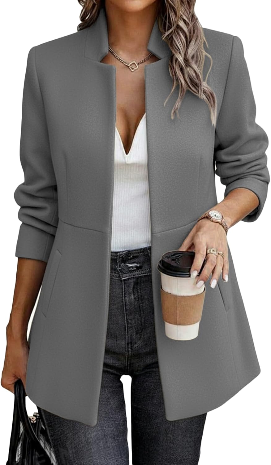 Mina Self 2026 Spring Women's Herringbone Tweed Blazer Jacket - Long Fully Lined Open Front Work Office Coat with Pockets