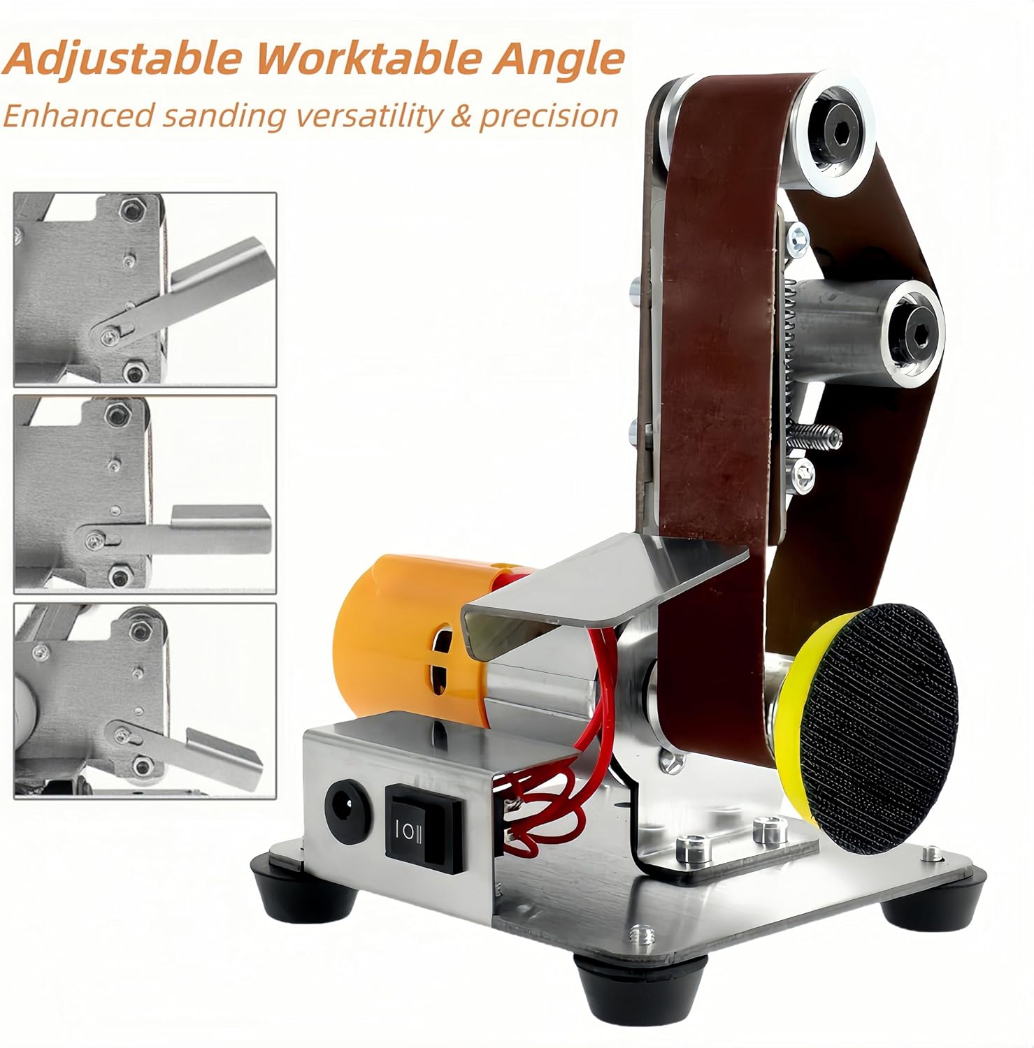 Mini Benchtop Belt Sander, Electric Knife Sharpener, Power Grinder Polisher Sander Sanding Machine for Woodworking Metal Working Knife Making 4000-9000RPMMini Benchtop Belt Sander features a rotating speed of 4000 - 9000rpm (7-gear adjustable), supporting forward and reverse rotating, perfectly meeting various sanding polishing tasksMini Benchtop Belt Sander is made from high-quality stainless steel, built-in with a pure copper motor, ensuring excellent performance with long-lasting durabilityMini Benchtop Belt Sander’s worktable can be adjusted to multiple angles, providing enhanced sanding flexibility and precisionElectric Knife Sharpener offers 10pcs x sanding belt (#120/ 320/600/ 800/ 1000) and 20pcs x sanding disc for various sanding demandsElectric Knife Sharpener is equipped with anti-slip and anti-vibration feet, ensuring stability during operationPower Grinder Polisher is compactly designed, perfect for wood/ metal/ plastic working, aluminum alloy polishing, turning tool burnishing, knife making, rust removal, deburring, and moreSpecificationsMaterial: Stainless SteelMaximum Current Output: 4.5 ASpeed: 4000RPM - 9000RPMSanding Belt Grits: #120/ 320/ 600/ 800/ 1000; 1.2*13inch(30*330mm)Package Content1 x Mini Electric Belt Sander10 x Sanding Belt(1.2*13inch)20 x Sanding Disc1 x Sanding Wheel1 x Polishing Wheel1 x Dustproof Cover3 x Wrench1 x Power AdapterOther Accessories