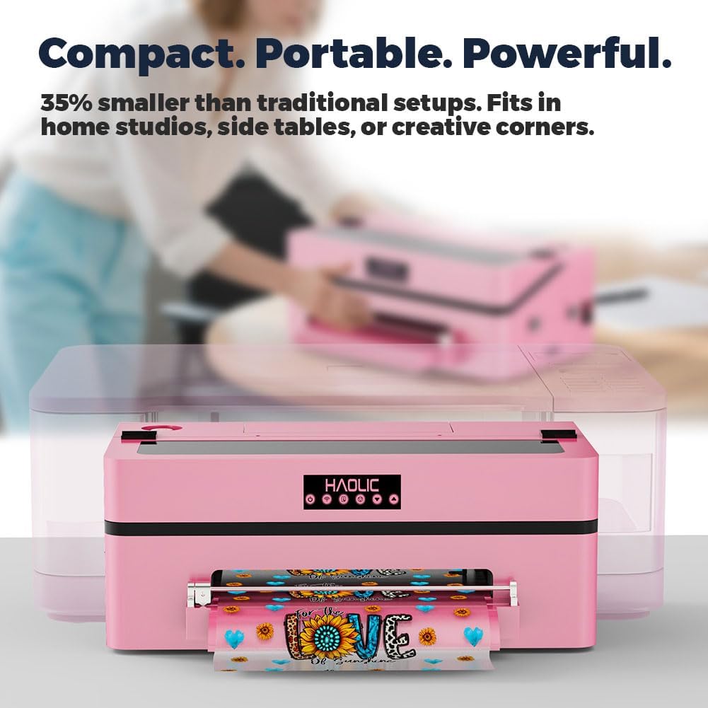 At Haolic, we believe every creator deserves the tools to bring ideas to life — without oversized machines or complicated setups. The Pink D8 DTF Printer was designed with makers, small studios, and home businesses in mind. Our team of engineers spent years refining color performance, stability, and usability to help creators print confidently from day one. Built with a compact 30% smaller body, the D8 fits neatly on any home workspace while delivering steady, high-definition output that supports everything from custom apparel to personalized gifts. Its intelligent maintenance design—automatic white-ink circulation, auto-cleaning, and nozzle protection—helps creators stay focused on their work instead of troubleshooting. From apparel crafters to startup brands, we’re here to support your journey — with reliable technology, bilingual assistance, and products built for real daily use.