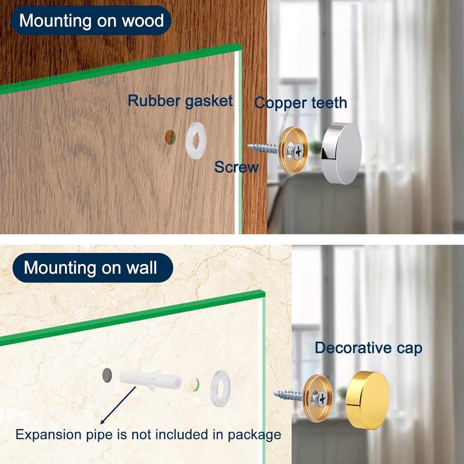 FEATURESThe cap is tightly gripped with the copper ring, and it is used with a non-slip rubber washer to increase friction and is not easy to loosen.WIDE APPLICATIONSCan be installed on mirrors, glass signboards, bathroom panels, coffee tables, other wood or glass furniture, etc.SOME NOTES FOR YOUShooting light and display may cause the product's color on the image to be different from the actual color. Hope for your understanding.Specifications:Material: BrassFinish: PolishedColor: GoldCap Diameter: 12mmCap Thickness: 5mmPackage Content:4pcs x Decorative Screw Cap