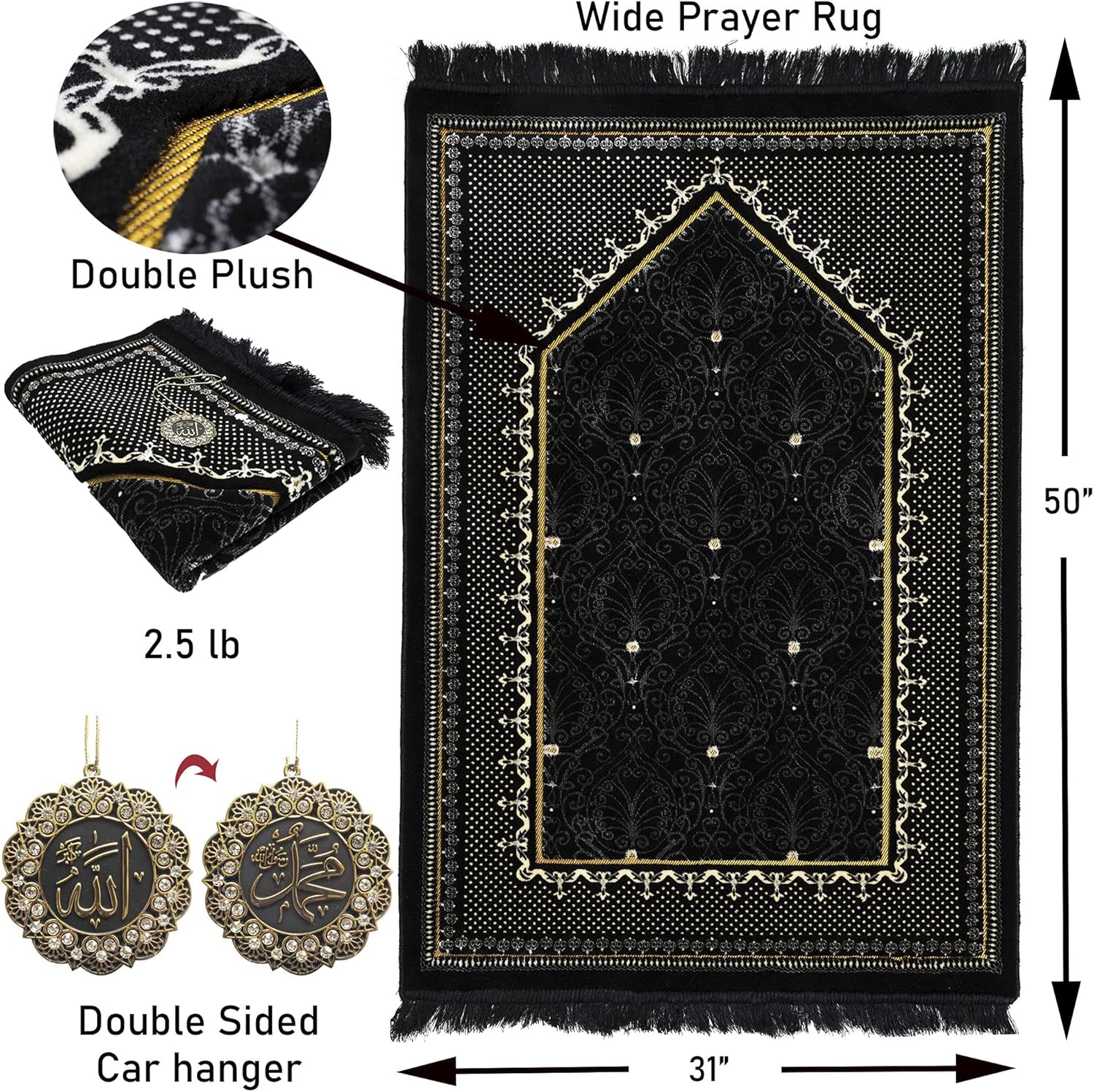 Modefa Islamic Prayer Rug ---> Looking for a sajjadah with extra cushion? You've found it! Our Double Plush prayer mats are one of our thickest and largest single person velvet prayer rugs, helping to provide Muslims with a comfortable experience during salat. Comes with a free car hanging decoration! Amazing plush prayer rug that makes for a good Muslim gifts for men for any special occasion! Also great Islamic gifts for women! Why We Love It---> The regal and elegant swirling pattern calls to mind Ottoman royalty, which is why our Topkapi rug is so named -- Topkapi Palace is the historical palace of the Ottoman Sultans. Combine this with the luscious softness and thickness that our Double Plush praying carpets are known for, and you've got a janamaz that is sure to wow. Available in several beautiful colors and is the perfect Islamic gift or Eid gift or Ramadan gifts! Thickness Scale ---> 8/10: Our Modefa Thickness Rating on this Muslim prayer rug is a 8 out of 10. This means it is thicker than most Islamic prayer rugs, and is one of the thickest Muslim prayer mat we carry. The thickness on this mat for prayer makes it great for using on harder floors. Great Muslim rug and thick praying rug for daily salah prayers for Muslims. Quality You Can Feel ---> Our salah mat are made in Turkey, so you know it is quality you can trust! Our Double Plush rugs are made of high quality, dense velvet and are super soft to the touch. These praying mat are machine made, but hand-finished with the best workmanship Turkey has to offer. Specifications ---> Size: 80 x 120cm (31.5 in x 47.25 in) | Material: Dense Velvet | Care: Hand wash, line dry for best results. May be washed on gentle cycle, cold, in a washing machine, but be aware that the tassels may come loose. We do not recommend regular washing. | Weight: 2.5 lbs