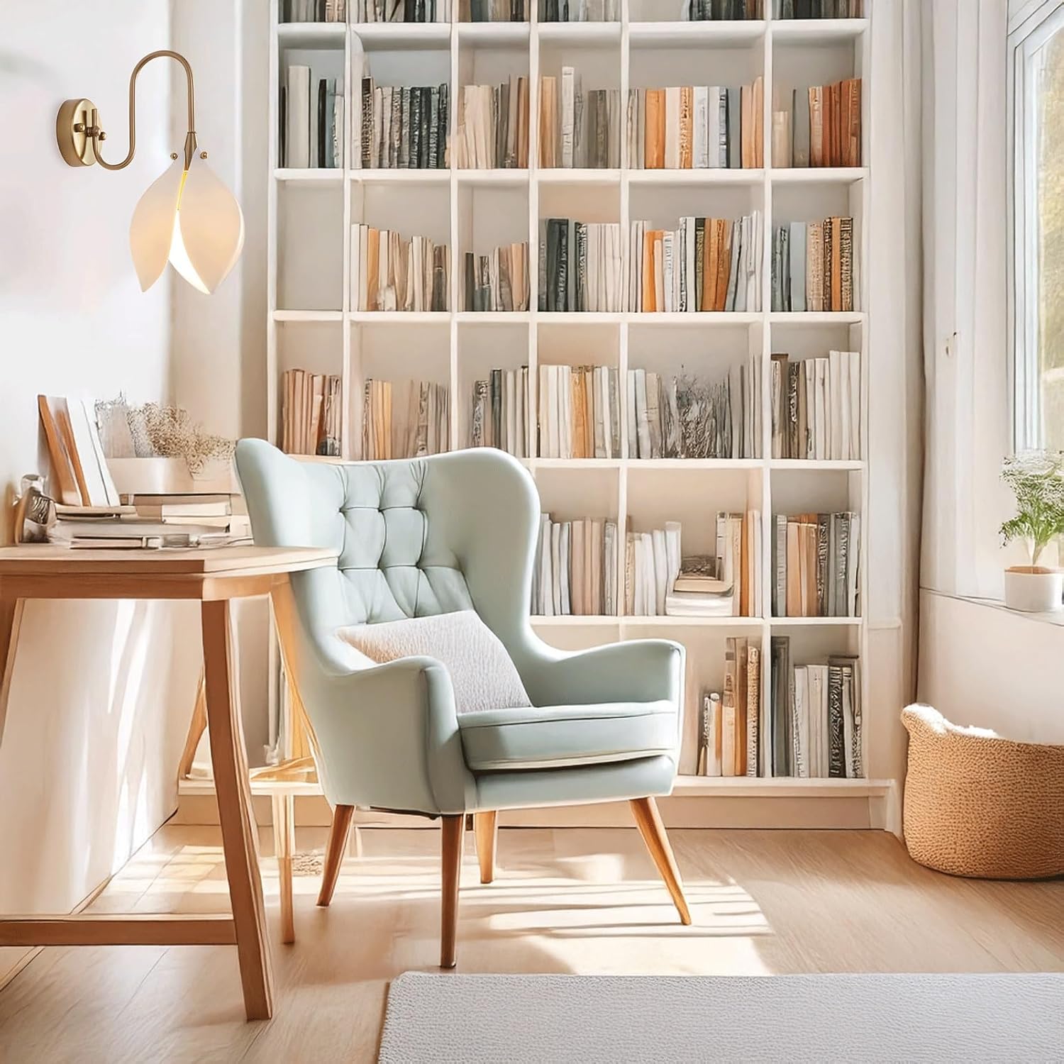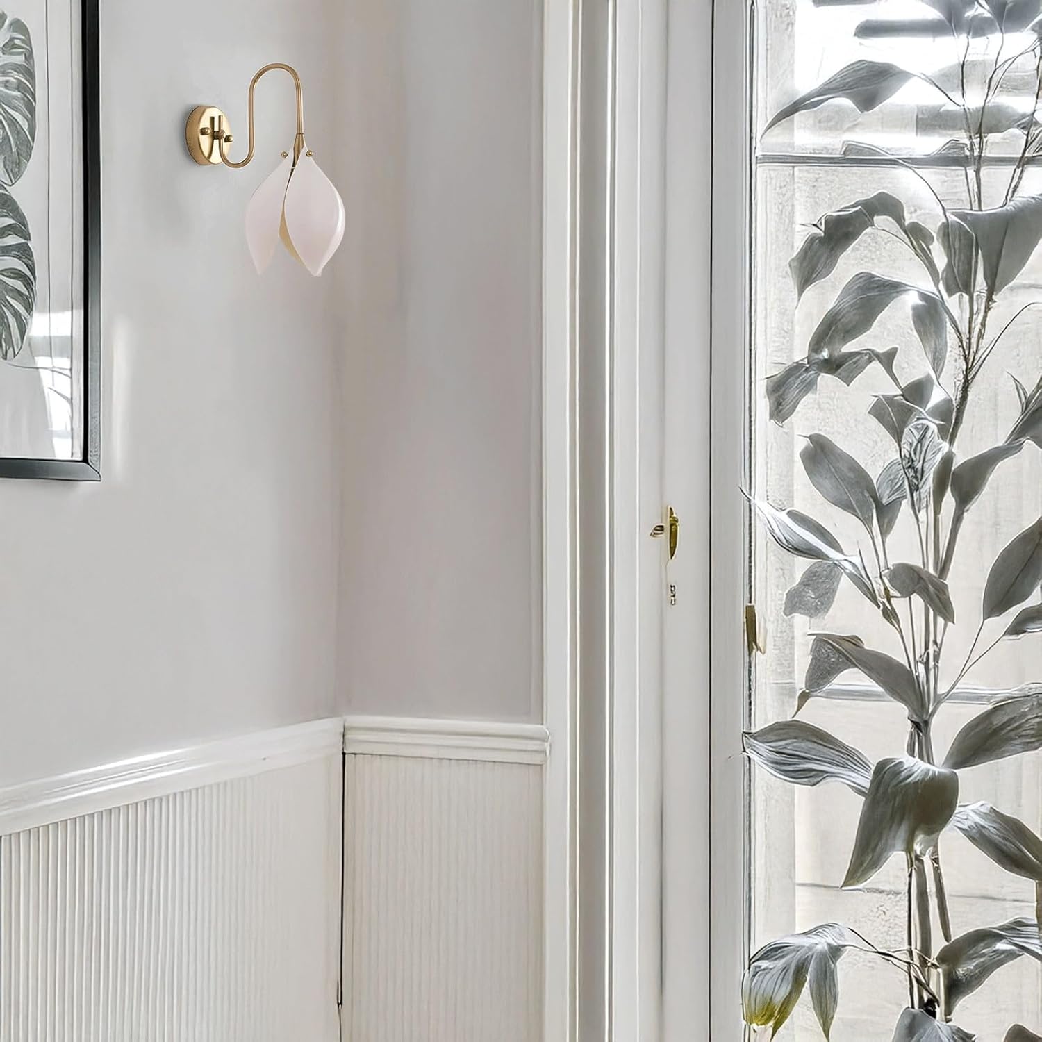 Product Parameters:Type: Wall Sconce / Wall LampStyle: Modern, Nordic, Minimalist, Contemporary, Decorative, Ambient Lighting, Botanical, Material: Metal (backplate, arm - brass), Ceramic (petal shades - matte white)Color: Brass (metal), Matte White (ceramic shades)Dimensions:Overall Height: 13.4" (34cm)Projection from Wall: 10.2" (26cm)Shade Diameter (widest part): 6.1" (15.5cm)Backplate Diameter: 3.9" (10cm)Socket Type: E27Number of Bulbs: 1Bulb Included: NoOptimized Special Feature: This modern Nordic wall sconce features an elegant brass metal arm curving gracefully to support two delicate petal-shaped matte white ceramic shades. Designed to house an E27 bulb (not included), it casts a soft, diffused light, creating a serene and inviting ambiance with an touch. Its unique blend of metal and ceramic, combined with a botanical-inspired design, makes it a decorative and functional light source, ideal for bedrooms, living rooms, hallways, or entryways, enhancing a contemporary, minimalist, or Nordic-inspired décor.Applicable Space: Ideal for Bedroom Bedside, Living Room, Hallway, Entryway, Foyer, Study Room, Dining Room (as accent), Office, Hotel, or other spaces desiring modern decorative lighting.