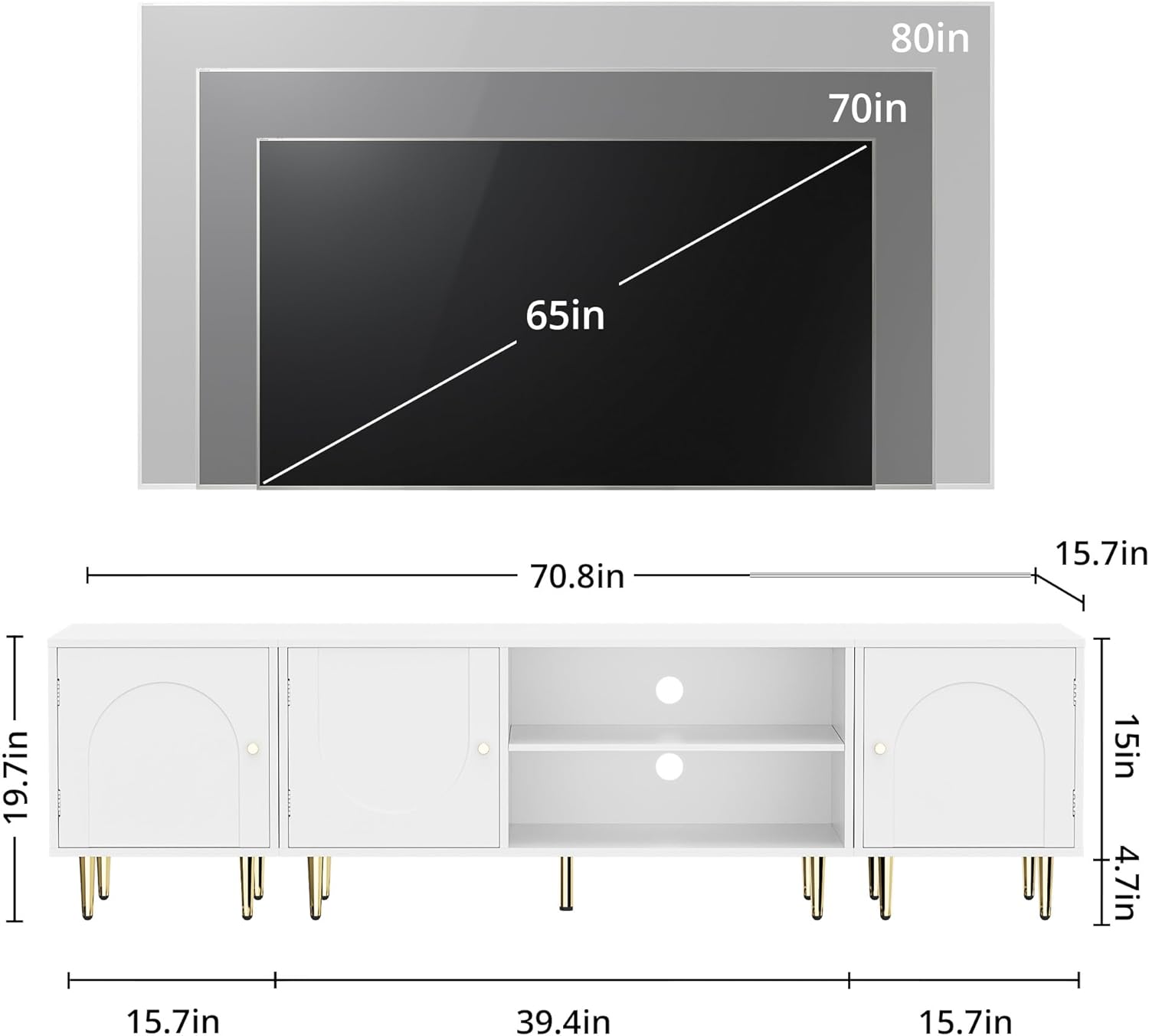 • 📺️【TV Stand for TVs up to 80"】- This TV Stand with doors can accommodate most flat screen/curved TVs. The assembled dimension of 70.8"L x 15.7"D x 19.7"H, it's recommended for TVs up to 80". Suitable for all decor styles, adding aesthetic to your living room and bedroom.