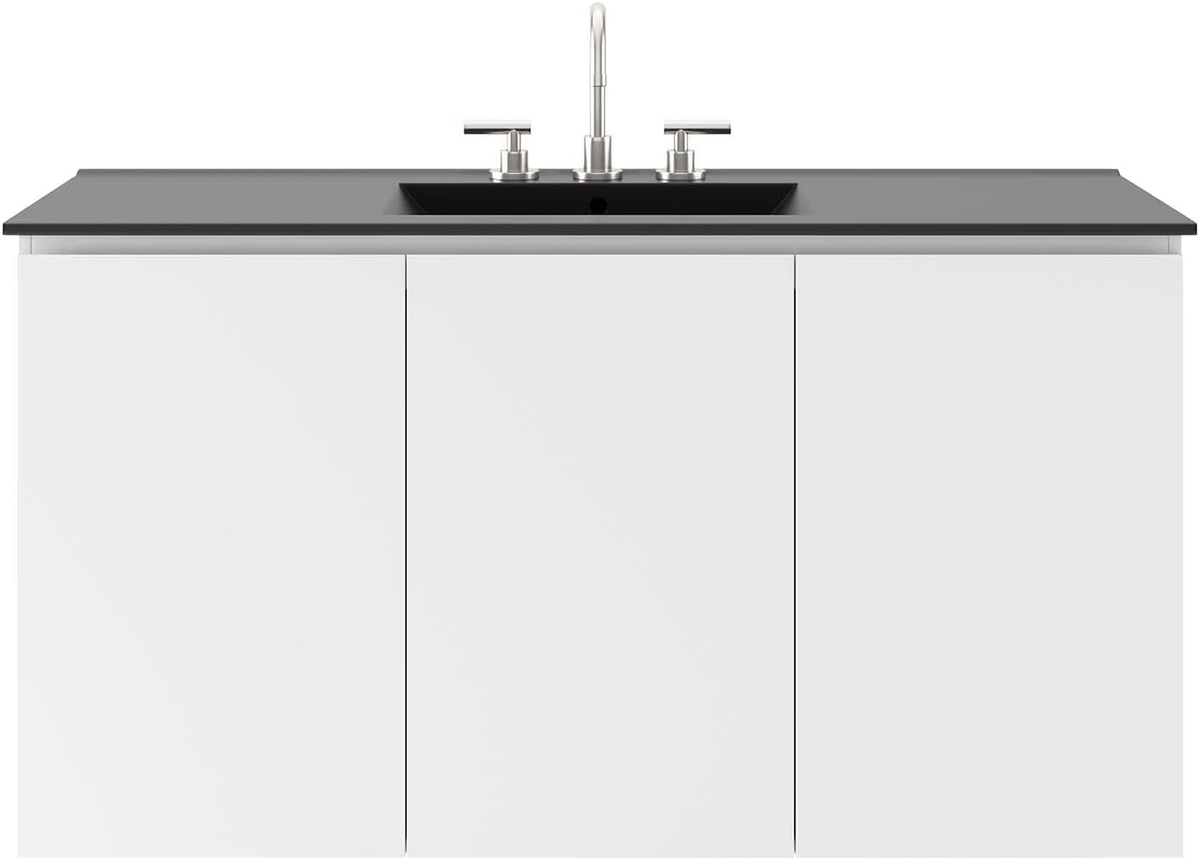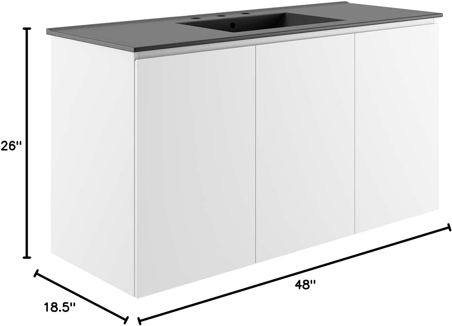 The sleek look and clean-lined silhouette of the Bryn 48" Wall-Mount Bathroom Vanity add modern style to your bathroom space. Durably crafted with particleboard and melamine, this vanity mounts directly to the wall and features ample storage space under the sink behind three soft-close doors. Bryn features a cut-out design to accommodate plumbing. This vanity is complete with a ceramic sink basin with 8-inch centerset holes and an integrated countertop. Fixtures not included. Assembly required.Features:- Material: Melamine and particleboard wood, ceramic- Finish: White, black- Modern bathroom vanity- Soft-close doors- Wall-mount design- Ceramic sink with integrated countertopSpecifications:- Product Dimensions: 26"H x 48"W x 18.5"D- Product Weight: 131 lbs