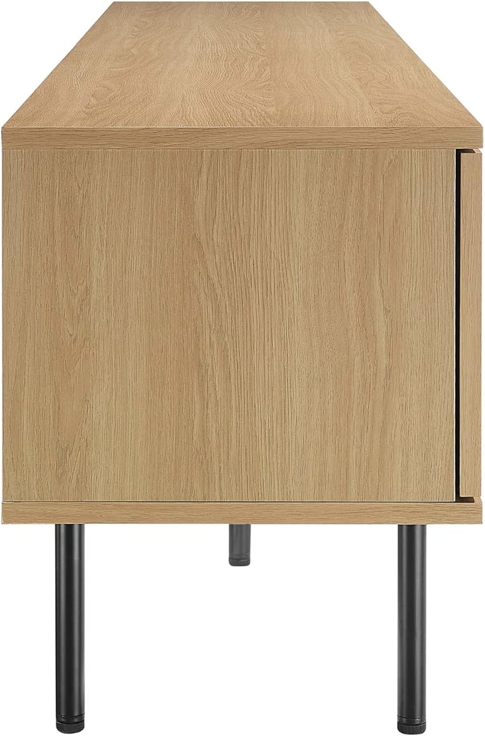 Bring trending organic aesthetics to your living space with the Cambria TV Stand. This entertainment center rests on cylindrical metal legs with non-marking foot caps and features a natural rattan weave along the front of two sliding doors that partially conceal the shelving area. A versatile addition to a living room, bedroom, home office, or lounge area, this media console is crafted with durable particleboard and features three cable management holes that also allow for flow-through ventilation. Keep visual space clean with the ample storage space for media essentials. This entertainment stand accommodates flat screen TVs up to 76". Assembly required. Weight Limit: 220 lbs.Features:- Materials: Rattan, particleboard- Finish: Oak- Sliding Doors- Non-Marking Foot Caps- Cable Management HolesSpecifications:- Product Dimensions: 20.5"H x 69.5"W x 15.5"D- Product Weight: 71 lbs