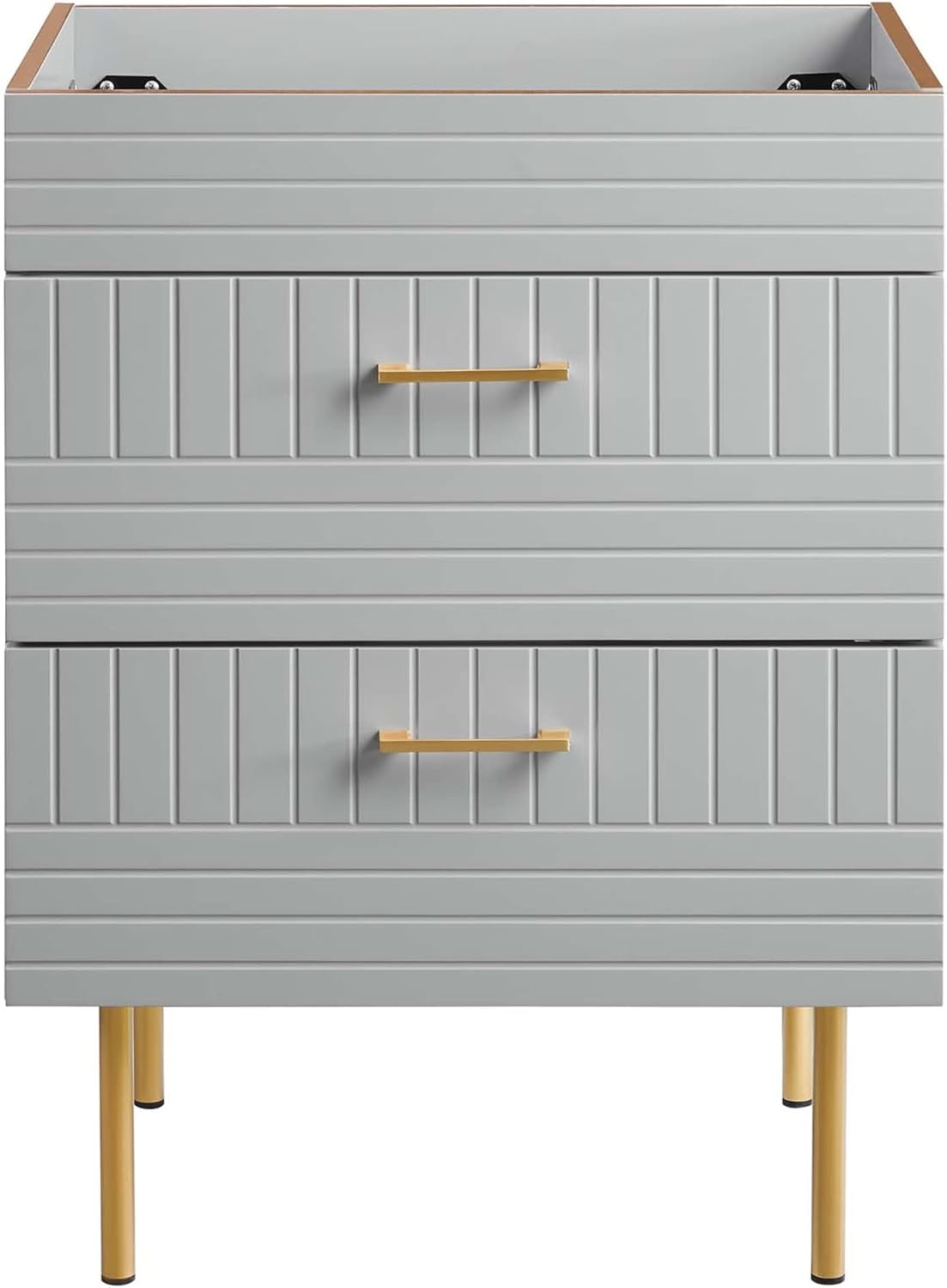 Refresh your bathroom space with the contemporary style of the Daybreak 24" Bathroom Vanity. Featuring a modern silhouette, sophisticated matte finish, and brushed gold metal hardware, this vanity is durably crafted with a blend of rubberwood, MDF, and particleboard to create a lasting vanity for your bathroom. Raised off the ground by gold metal legs, this bathroom vanity is complete with ample storage in its drawers to accommodate bathroom essentials and a cut-out design in the top drawer for plumbing. Includes non-marking foot caps. Assembly required. Sink basin and fixtures not included.Features:- Materials: Rubberwood, MDF, particleboard, metal- Finish: Light gray, gold- Full-extension drawers- Non-marking foot capsSpecifications:- Product Dimensions: 31"H x 23.5"W x 18"D- Product Weight: 46 lbs