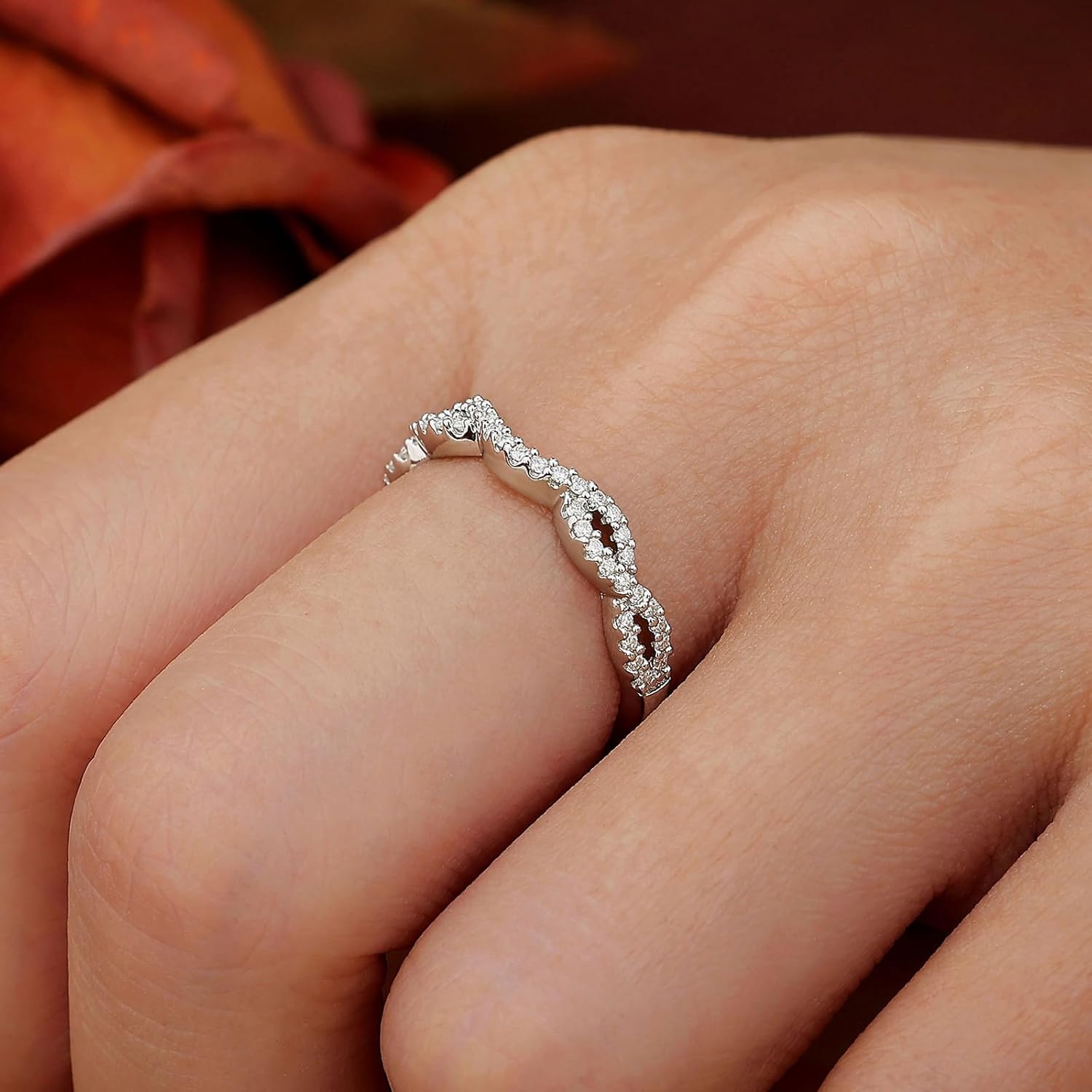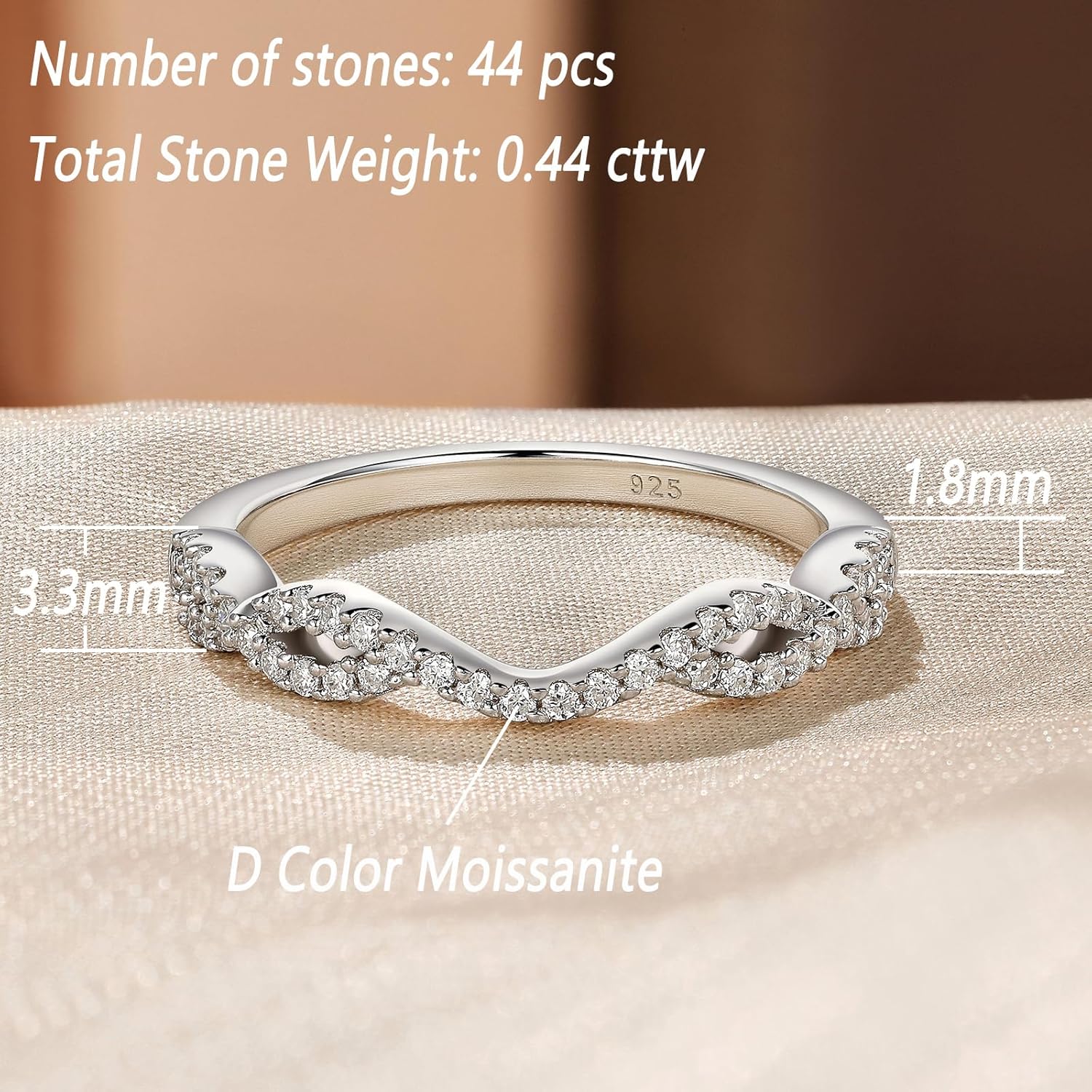 HAWRIN affordable luxury 1 piece half twisted infinity eternity ring. This womens eternity ring is crafted from genuine SOLID 925 Sterling Silver and Highest Grade Moissanite. The stackable wedding band features 44pcs white moissanite in prong setting. Top quality grade Moissanite stones capture all the surrounding light and sparkles to perfection, display amazing enriched clarity just like real diamond!