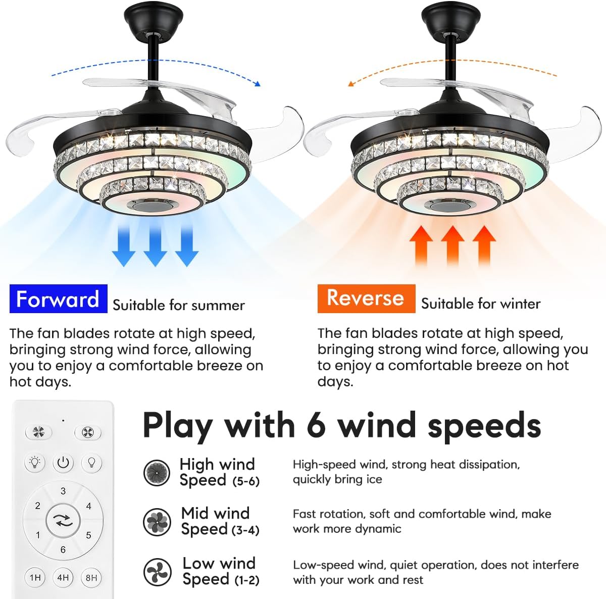 • Remote Control Fandelier Ceiling Fan: Crystal fandelier ceiling fan has 6 fan speeds, 3 normal light colors, 1/4/8H timer setting; All functions of the modern ceiling fan can be easily controlled independently by remote