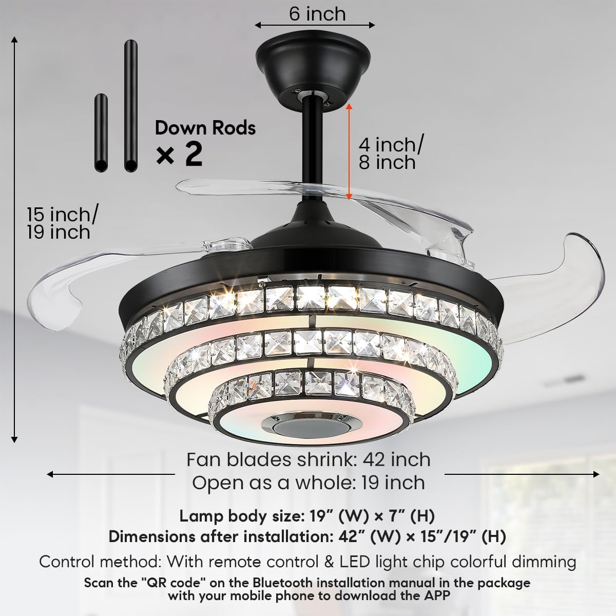 • Fandelier Size: Black fandelier ceiling fan with light Diameter 42" when extended, 19" when closed. Bluetooth chandelier ceiling fan comes with 4'' and 8" down rods, vertical height 15"/19"; Bluetooth ceiling fan with light and speaker is suitable for ceilings of different heights